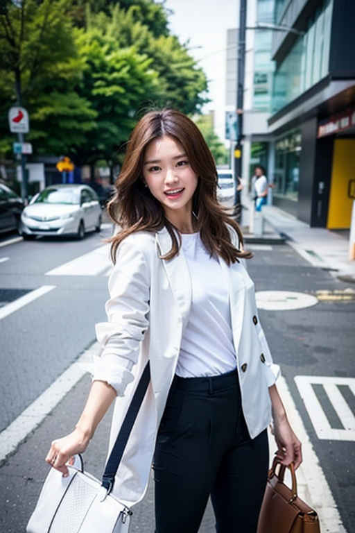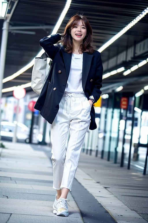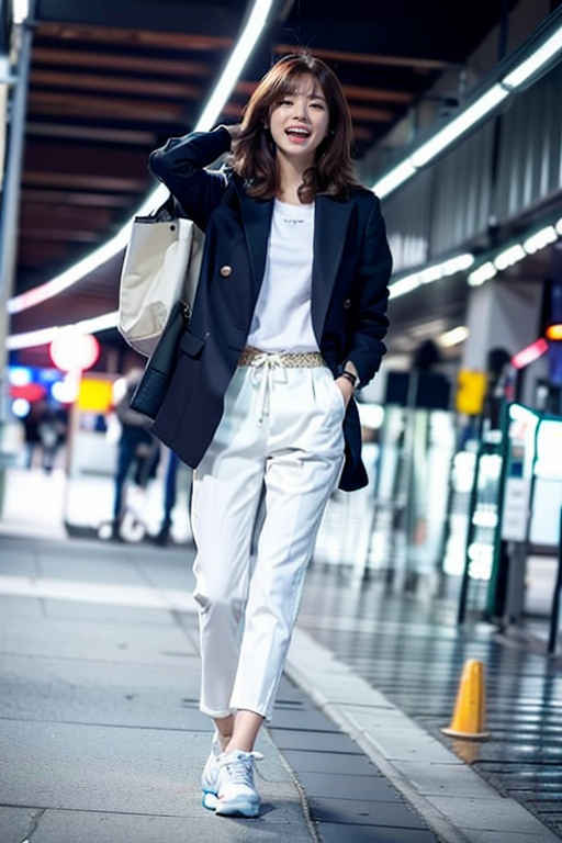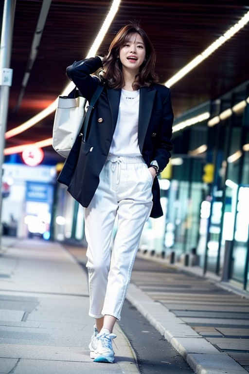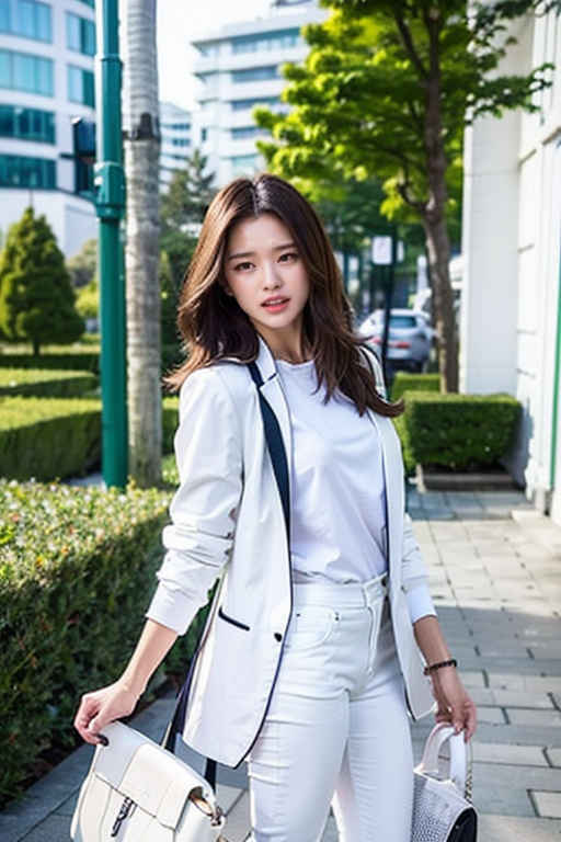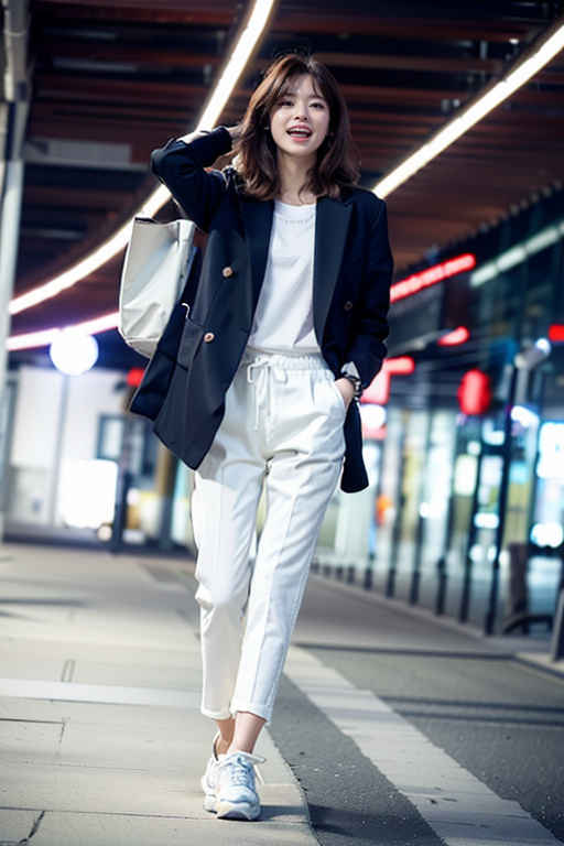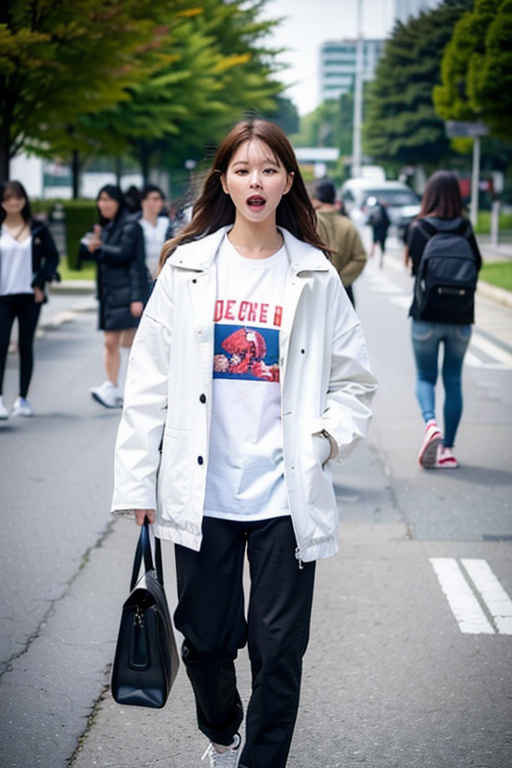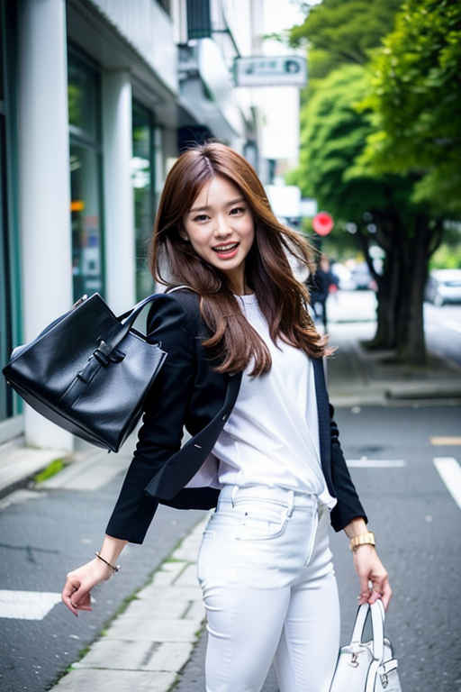 ソロ、パンツ、靴、バッグ、白いパンツ、シャツ、ジャケット、白いシャツ、リアル、ポケットに手、スニーカー、茶髪、白い履物、女の子 1 人、屋外、見る人を見る、全身、長い髪、口を開けている、ぼやけている、写真の背景、立っている、ハンドバッグ、歩いている、はだけた服、黒いジャケット | |