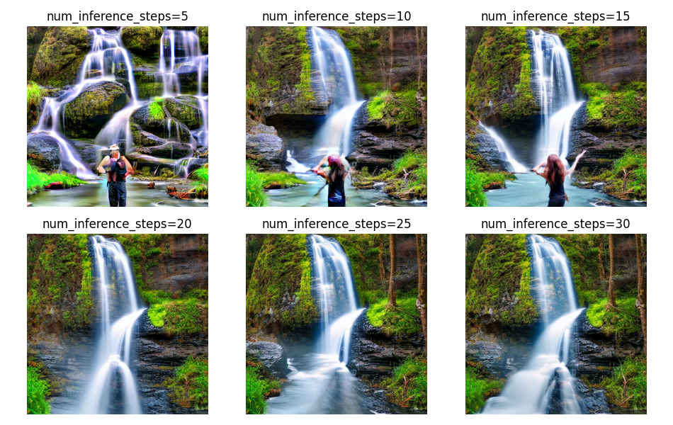 ## sd_008.py「自然と滝の写真」ステップ数(num_inference_steps)の変化 import torch from diffusers import StableDiffusionPipeline, logging from diffusers.utils import make_image_grid import matplotlib.pyplot as plt logging.set_verbosity_error() ## 不要なエラー出力の抑制 # 画像生成 def image_generation(n_steo): # パイプラインを作成 pipeline = StableDiffusionPipeline.from_single_file(model).to(device) # Generatorオブジェクト作成 generator = torch.Generator(device).manual_seed(seed) # 画像を生成 img = pipeline( prompt = prompt, num_inference_steps = n_step, generator = generator ).images[0] return img # モデルのフォルダーのパス model = "/StabilityMatrix/Data/Models/StableDiffusion/SD1.5/v1-5-pruned-emaonly.safetensors" # GPUを使う場合は"cuda" 使わない場合は"cpu" device = 'cuda' # プロンプト prompt = "nature and waterfall photography" seed = 1234 # seed 固定 # 複数画像を生成 plt.figure(figsize=[9.5, 6], dpi = 100) for i,n_step in enumerate(range(5, 31, 5)): img = image_generation(n_step) plt.subplot(2, 3, i + 1, title = "num_inference_steps=%d"%n_step) plt.imshow(img) plt.axis('off') # メモリー開放 if device == 'cuda': torch.cuda.empty_cache() elif device == 'mps': torch.mps.empty_cache() plt.tight_layout() plt.savefig('image_008.png') plt.close()・結果を固定したい場合は seed を指定して torch.Generator オブジェクトを作ってパイプラインを実行する時に generator パラメータを指定する