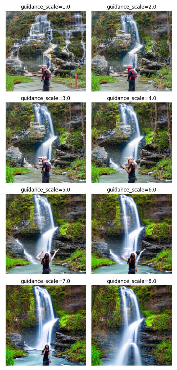 ## sd_009.py「自然と滝の写真」プロンプトの重要度(guidance_scale) import torch from diffusers import StableDiffusionPipeline, logging from diffusers.utils import make_image_grid import matplotlib.pyplot as plt logging.set_verbosity_error() ## 不要なエラー出力の抑制 # 画像生成 def image_generation(g_scale): # パイプラインを作成 pipeline = StableDiffusionPipeline.from_single_file(model).to(device) # Generatorオブジェクト作成 generator = torch.Generator(device).manual_seed(seed) # 画像を生成 img = pipeline( prompt = prompt, num_inference_steps = 20, guidance_scale = g_scale, generator = generator ).images[0] return img # モデルのフォルダーのパス model = "/StabilityMatrix/Data/Models/StableDiffusion/SD1.5/v1-5-pruned-emaonly.safetensors" # GPUを使う場合は"cuda" 使わない場合は"cpu" device = 'cuda' # プロンプト prompt = "nature and waterfall photography" seed = 1234 # seed 固定 # 複数画像を生成 plt.figure(figsize=[12.5, 6], dpi = 100) for i in range(1, 9): img = image_generation(i) plt.subplot(2, 4, i, title = "guidance_scale=%.1f"%i) plt.imshow(img) plt.axis('off') # メモリー開放 if device == 'cuda': torch.cuda.empty_cache() elif device == 'mps': torch.mps.empty_cache() plt.tight_layout() plt.savefig('image_009.png') plt.close()・guidance_scale パラメータは「どれくらいプロンプトを重視するか」を決める数値