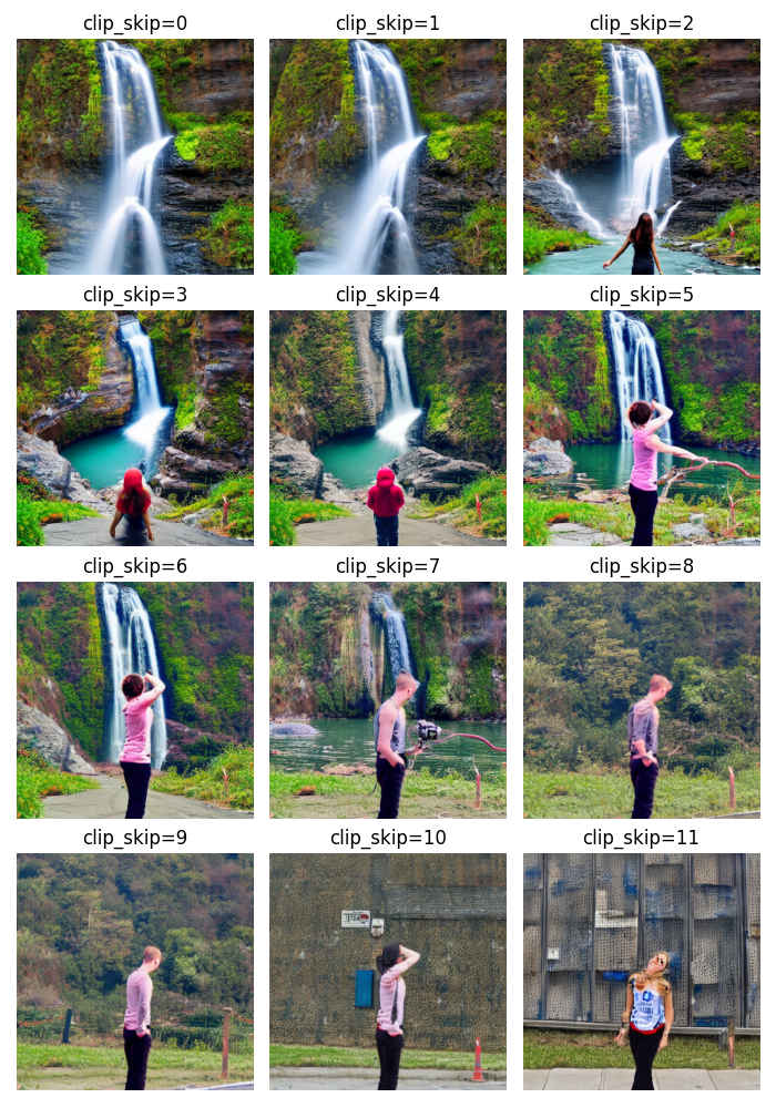 ## sd_010.py「自然と滝の写真」CLIPを飛ばす(clip_skip) import torch from diffusers import StableDiffusionPipeline, logging from diffusers.utils import make_image_grid import matplotlib.pyplot as plt logging.set_verbosity_error() ## 不要なエラー出力の抑制 # 画像生成 def image_generation(c_skip): # パイプラインを作成 pipeline = StableDiffusionPipeline.from_single_file(model).to(device) # Generatorオブジェクト作成 generator = torch.Generator(device).manual_seed(seed) # 画像を生成 img = pipeline( prompt = prompt, num_inference_steps = 20, guidance_scale = 7.5, clip_skip = c_skip, generator = generator ).images[0] return img # モデルのフォルダーのパス model = "/StabilityMatrix/Data/Models/StableDiffusion/SD1.5/v1-5-pruned-emaonly.safetensors" # GPUを使う場合は"cuda" 使わない場合は"cpu" device = 'cuda' # プロンプト prompt = "nature and waterfall photography" seed = 1234 # seed 固定 # 複数画像を生成 plt.figure(figsize=[7, 10], dpi = 100) for i in range(12): img = image_generation(i) plt.subplot(4, 3, i + 1, title="clip_skip=%d"%i) plt.imshow(img) plt.axis('off') # メモリー開放 if device == 'cuda': torch.cuda.empty_cache() elif device == 'mps': torch.mps.empty_cache() plt.tight_layout() plt.savefig('image_010.png') plt.close()