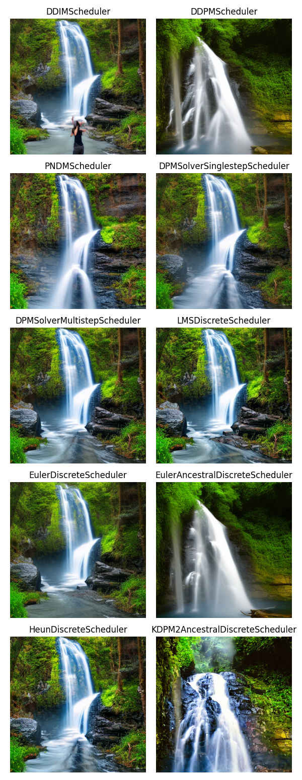 ## sd_011.py「自然と滝の写真」スケジューラー(scheduler)を変更 import torch import diffusers from diffusers import StableDiffusionPipeline, logging from diffusers.utils import make_image_grid import matplotlib.pyplot as plt logging.set_verbosity_error() ## 不要なエラー出力の抑制 # 画像生成 def image_generation(scheduler): # パイプラインを作成 pipeline = StableDiffusionPipeline.from_single_file(model).to(device) pipeline.scheduler = scheduler.from_config(pipeline.scheduler.config) # Generatorオブジェクト作成 generator = torch.Generator(device).manual_seed(seed) # 画像を生成 img = pipeline( prompt = prompt, num_inference_steps = 20, generator = generator ).images[0] return img # モデルのフォルダーのパス model = "/StabilityMatrix/Data/Models/StableDiffusion/SD1.5/v1-5-pruned-emaonly.safetensors" # GPUを使う場合は"cuda" 使わない場合は"cpu" device = 'cuda' # プロンプト prompt = "nature and waterfall photography" seed = 1234 # seed 固定 lis_schdl = [ 'DDIMScheduler', 'DDPMScheduler', 'PNDMScheduler', 'DPMSolverSinglestepScheduler', 'DPMSolverMultistepScheduler', 'LMSDiscreteScheduler', 'EulerDiscreteScheduler', 'EulerAncestralDiscreteScheduler', 'HeunDiscreteScheduler', 'KDPM2AncestralDiscreteScheduler', ] # 複数画像を生成 plt.figure(figsize=[6, 15.5], dpi = 100) for i, schdl in enumerate(lis_schdl): img = image_generation(getattr(diffusers, schdl)) plt.subplot(5, 2, i + 1, title=schdl) plt.imshow(img) plt.axis('off') # メモリー開放 if device == 'cuda': torch.cuda.empty_cache() elif device == 'mps': torch.mps.empty_cache() plt.tight_layout() plt.savefig('image_011.png') plt.close()
