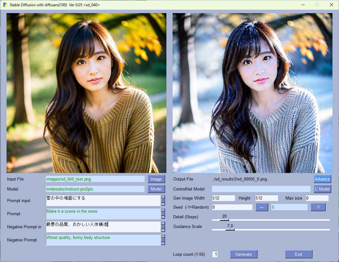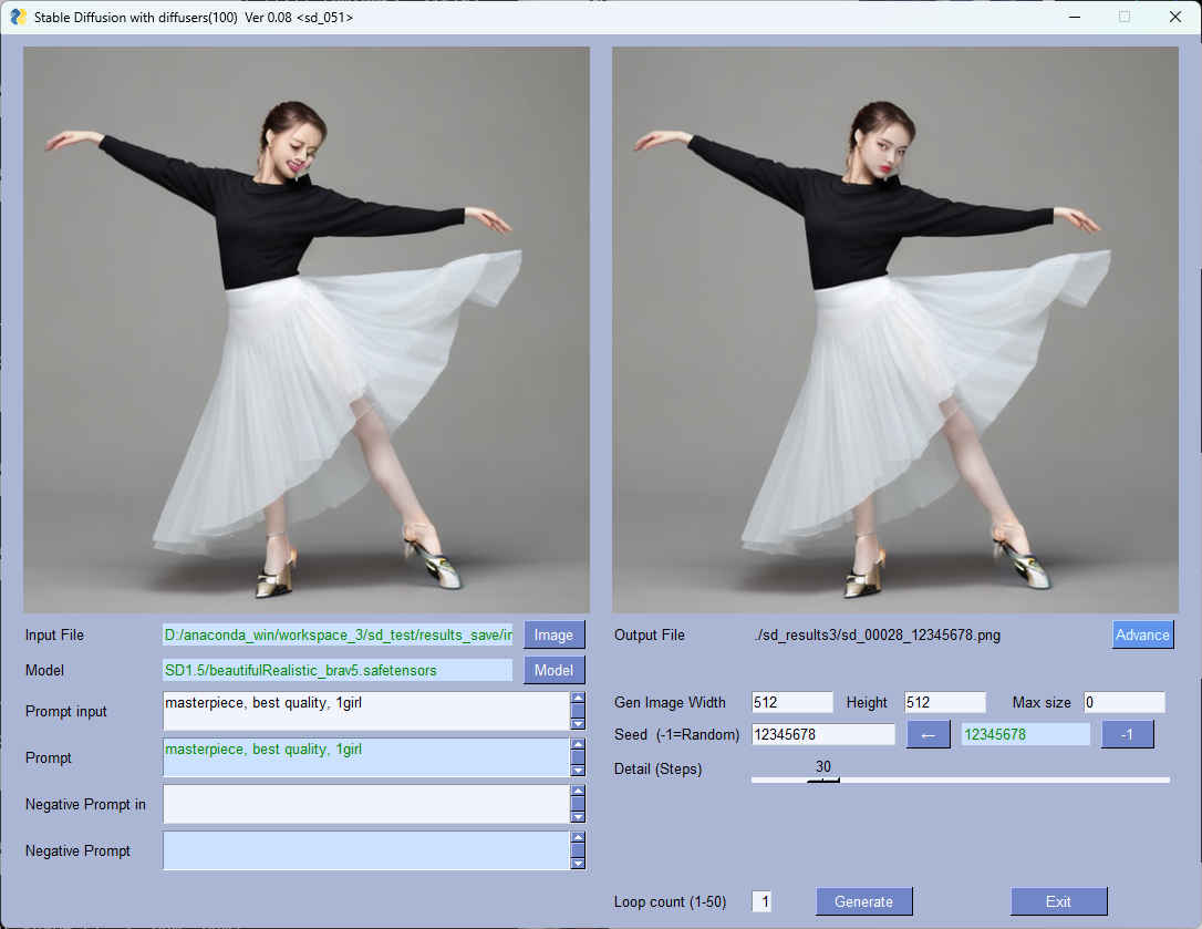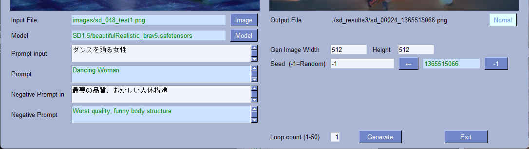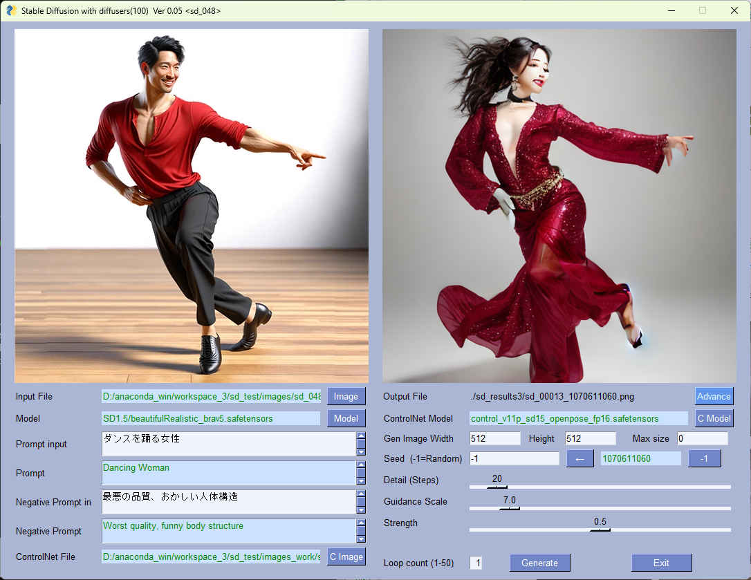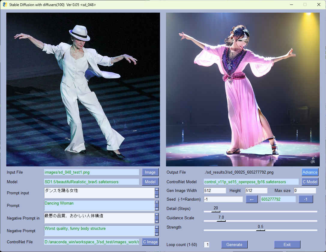 (sd_test) PS > python sd_100.py --pros_sel sd_048 Stable Diffusion with diffusers(100) Ver 0.05 <sd_048>: Starting application... --pros_sel : sd_048 --result_image : ./sd_results3/sd.png --cpu : False --log : 3 --model_dir : ../../../StabilityMatrix/Data/Models/StableDiffusion --model_path : SD1.5/beautifulRealistic_brav5.safetensors --ctrl_model_dir : ../../../StabilityMatrix/Data/Models/ControlNet --ctrl_model_path : control_v11p_sd15_openpose_fp16.safetensors --image_path : images/sd_048_test1.png --max_size : 0 --prompt : ダンスを踊る女性 --seed : -1 --step : 20 --neg_prompt : 最悪の品質、おかしい人体構造 --mode : True ** Start 1 ** prompt: Dancing Woman neg_prompt: Worst quality, funny body structure seed: 2292601352 Fetching 11 files: 100%|███████████████████████████████| 11/11 [00:00<?, ?it/s] Loading pipeline components...: 100%|████████████| 6/6 [00:00<00:00, 32.07it/s] 100%|██████████████████████████████████████████| 20/20 [00:02<00:00, 6.93it/s] result_file: ./sd_results3/sd_00012_2292601352.png ** Complete ** 00:00:08 ** Start 1 ** prompt: Dancing Woman neg_prompt: Worst quality, funny body structure seed: 1070611060 Fetching 11 files: 100%|███████████████████████████████| 11/11 [00:00<?, ?it/s] Loading pipeline components...: 100%|████████████| 6/6 [00:00<00:00, 31.88it/s] 100%|██████████████████████████████████████████| 20/20 [00:02<00:00, 7.23it/s] result_file: ./sd_results3/sd_00013_1070611060.png ** Complete ** 00:00:05 Finished.