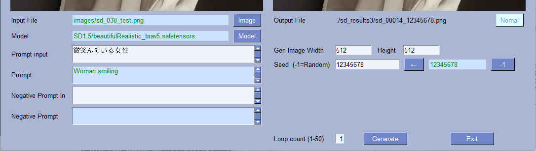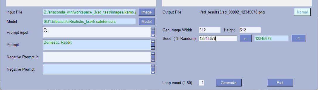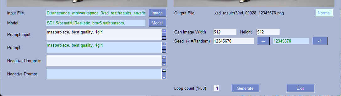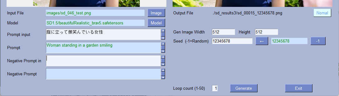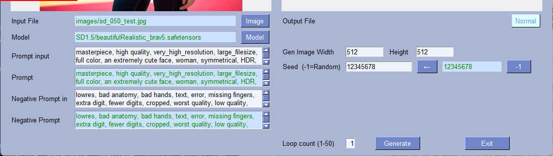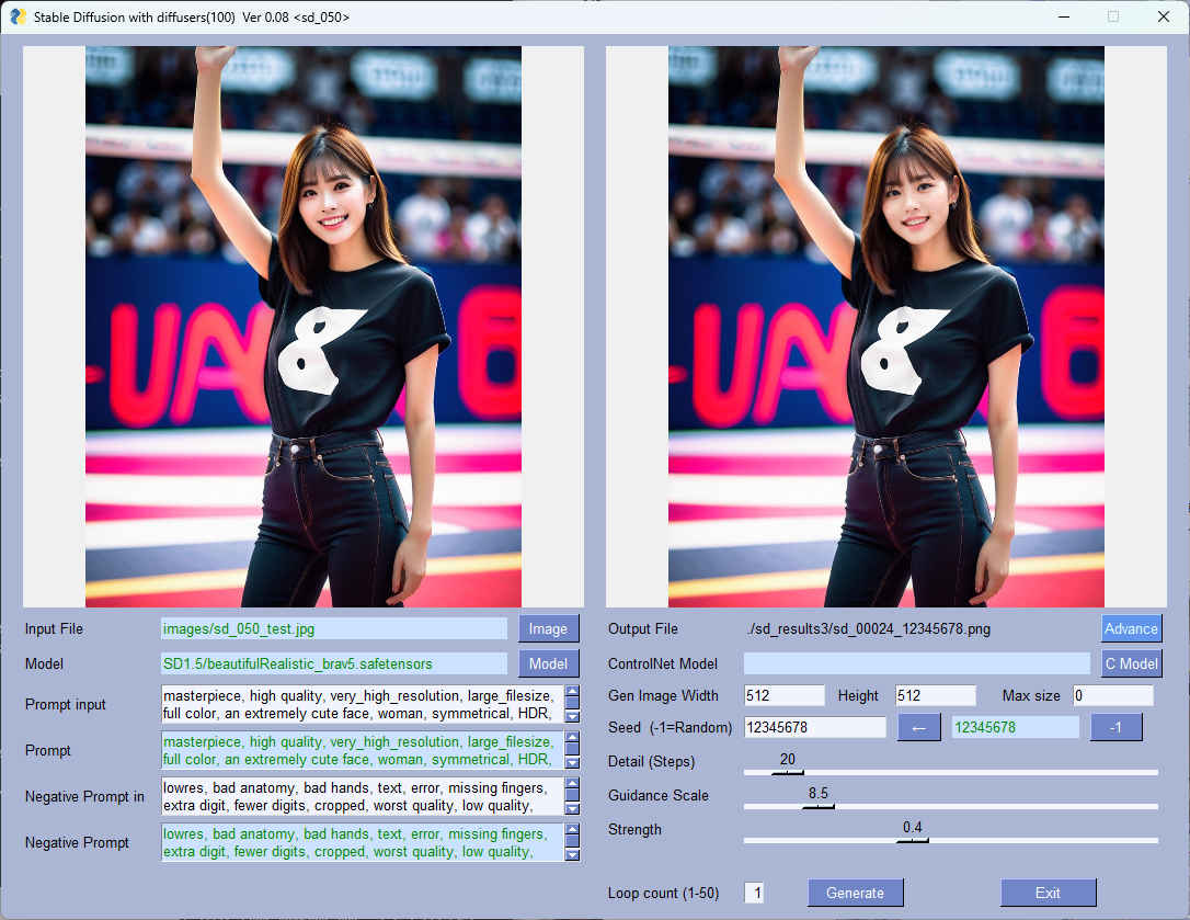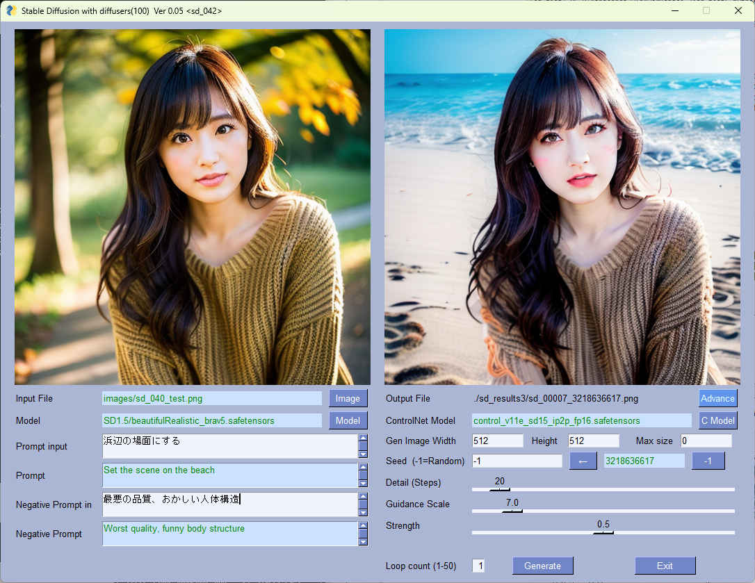 | --model_path | str | 'SD1.5/beautifulRealistic_brav5.safetensors' | モデルファイル | 〇 | 〇 |
