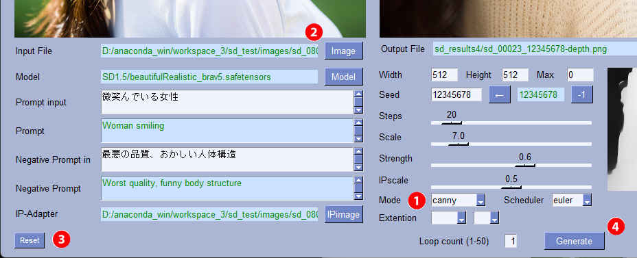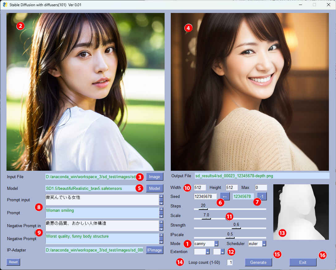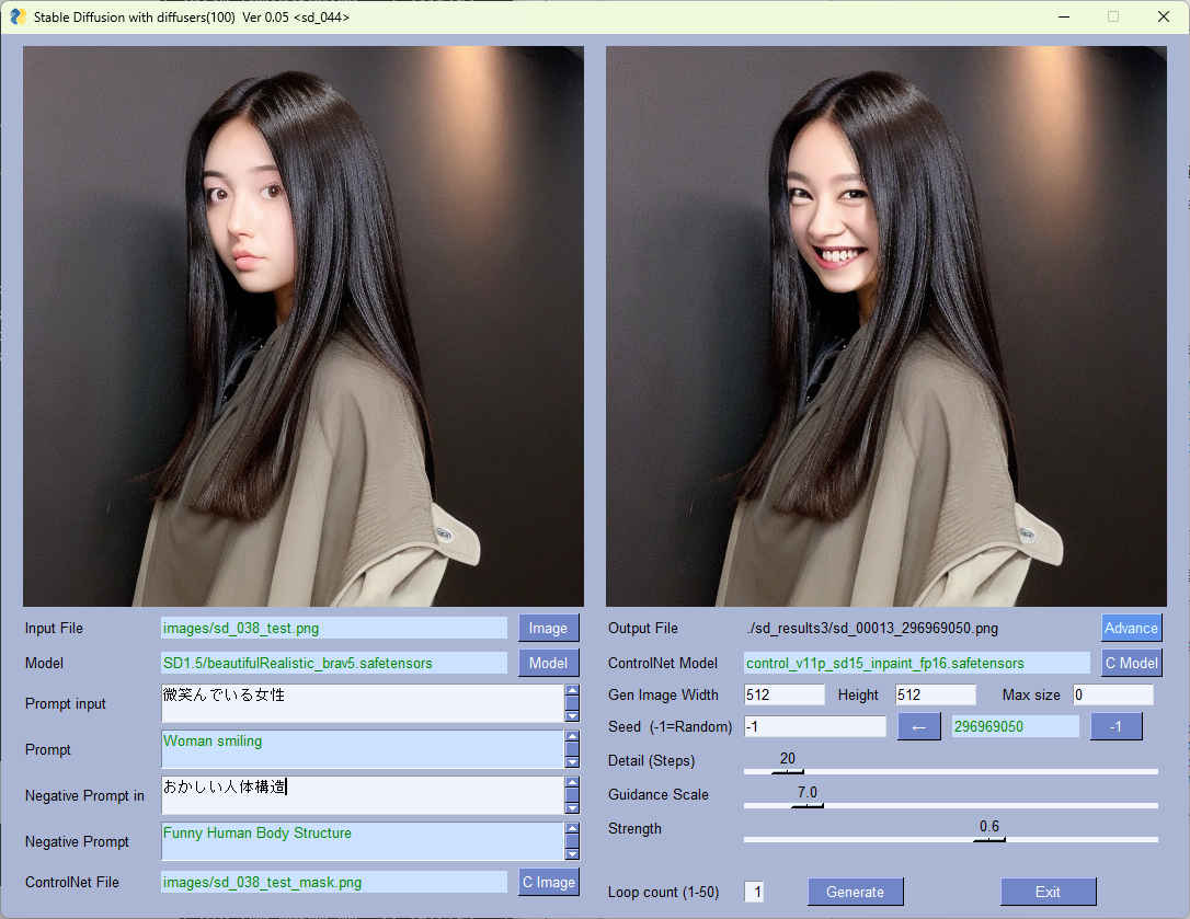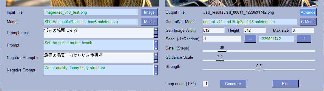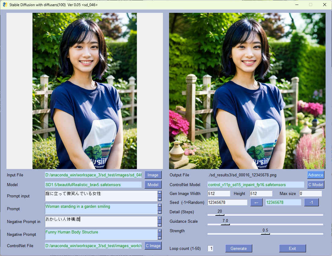| --model_path | str | 'SD1.5/beautifulRealistic_brav5.safetensors' | モデルファイル | 〇 | 〇 |