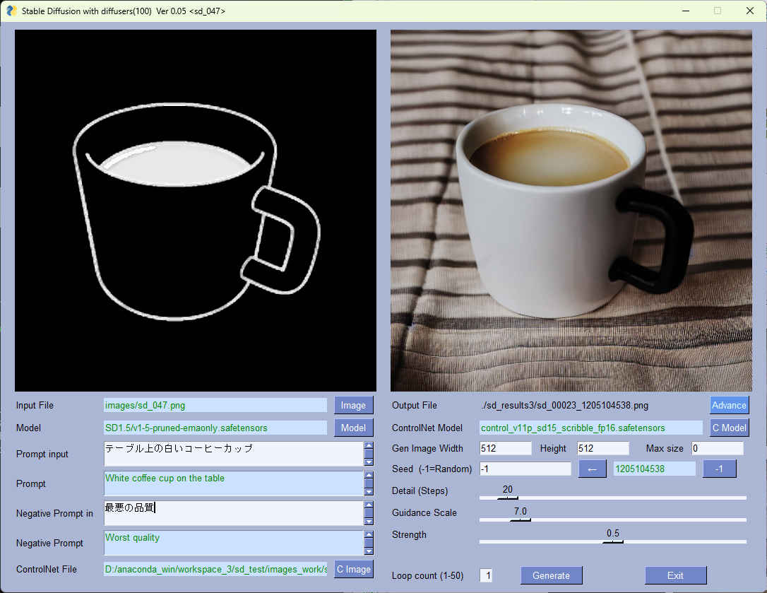 | ② | sd_101.py | 統合版 Step60 の機能(Step40~52,81,91を含む)GUI で操作 | txt2img/img2img/controlnet-pix2pix/inpaint/outpaint/scribble/ openpose/ADetailer/canny/lineart/depth/segment/shuffle/ normal_map/lineart_anime/mlsd/tile/paintex |