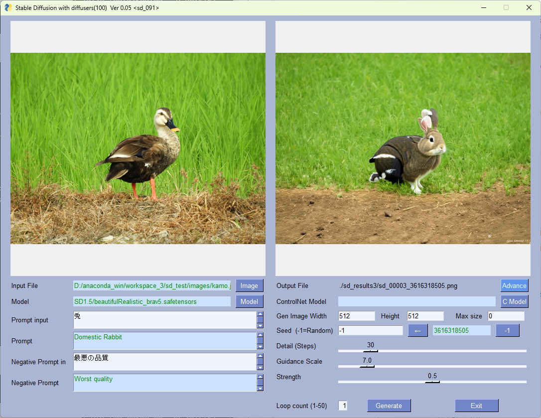 python sd_100.py --pros_sel sd_[081 / 091 / 040 / 042 / 044 / 046 / 047 / 048 / 050 / 051 / 052]・処理プロセスにより SD1.5 と SDXL のモデルに対応する(SD1.5 モデルは「SD1.5/」ディレクトリ名のフォルダに配置されていること)