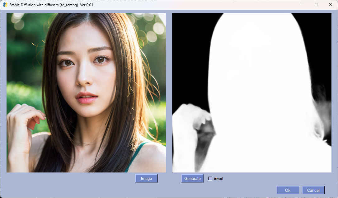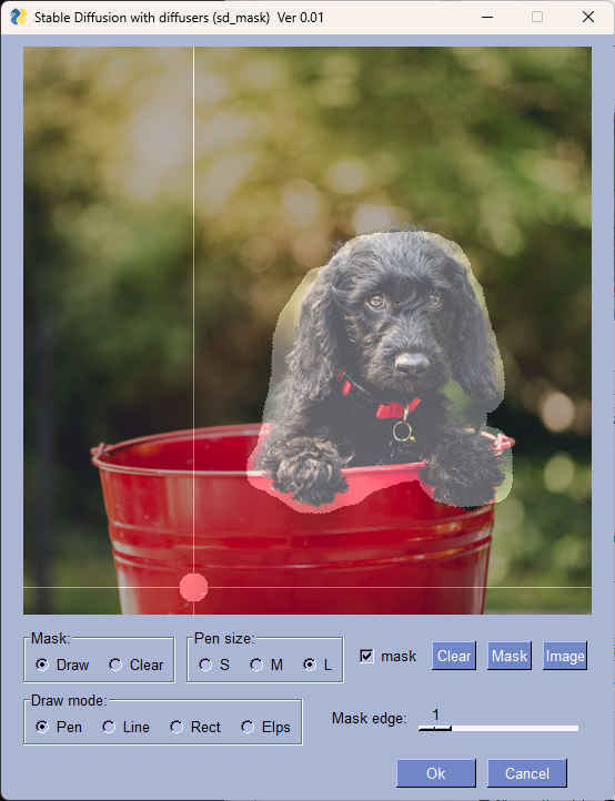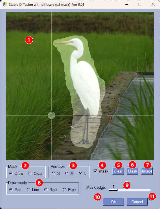 | sd_mask.py | マスク作成プログラム | もとになるイメージ画像を表示しながら簡単にマスク画像を作成 |