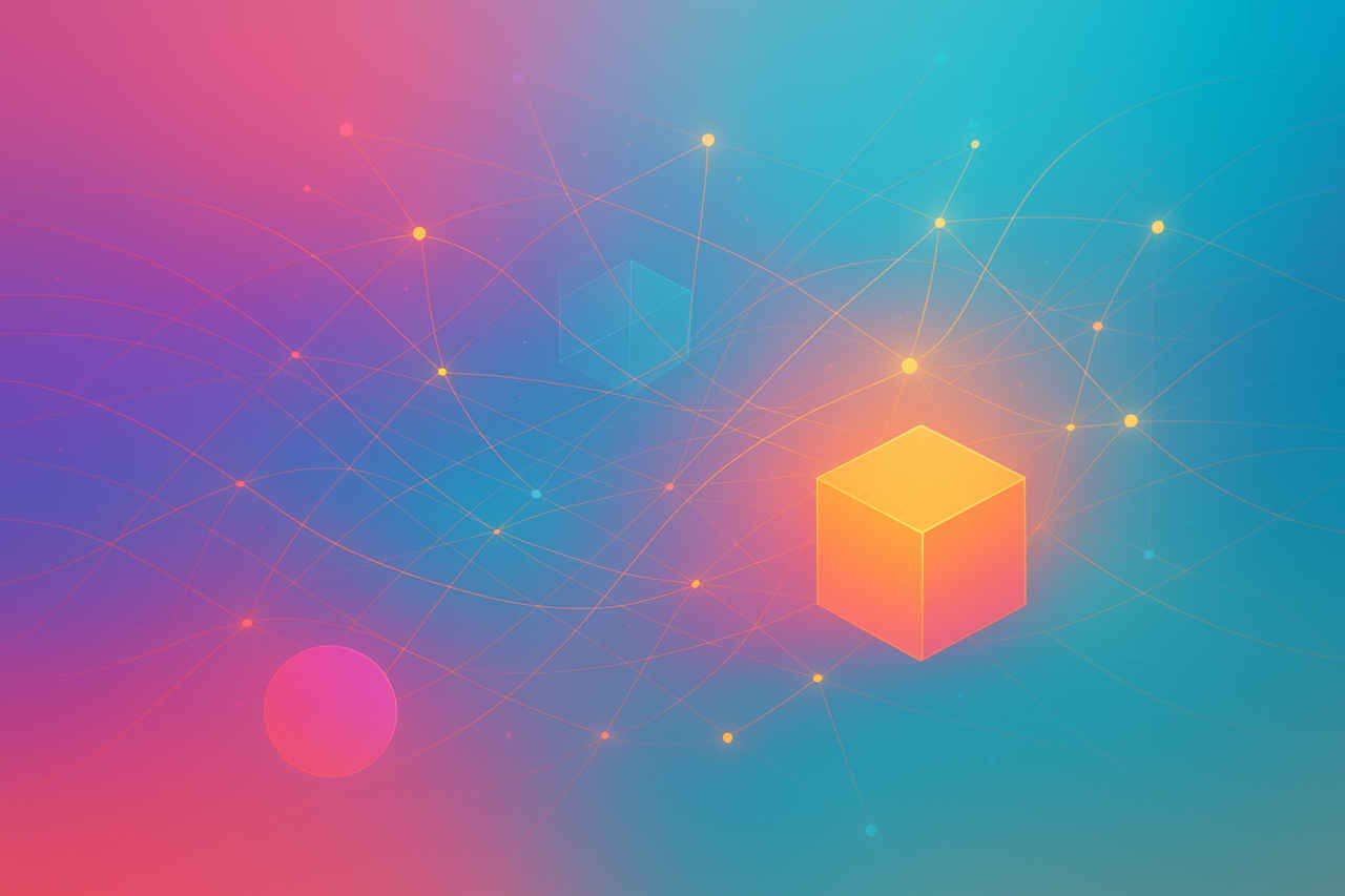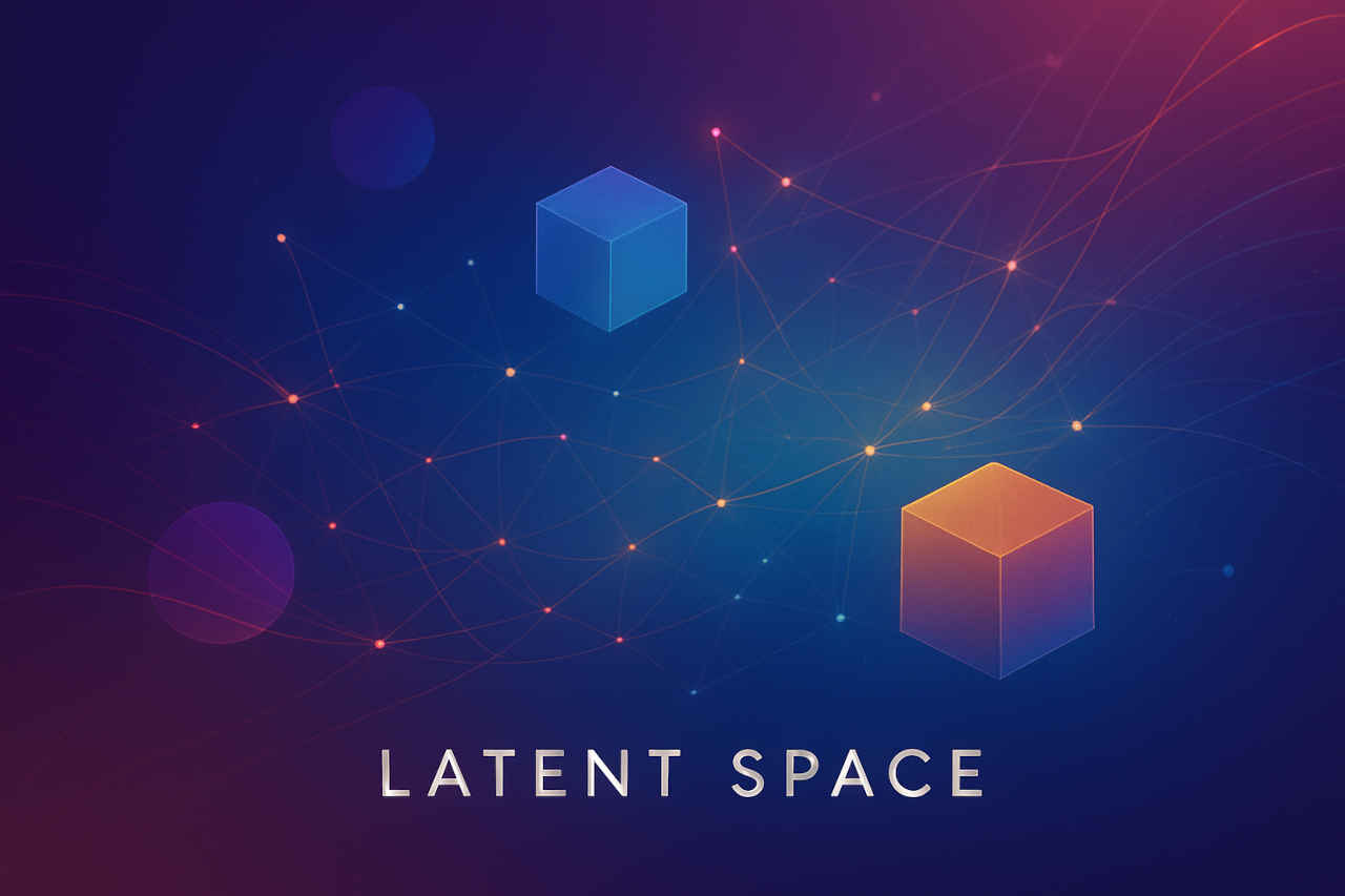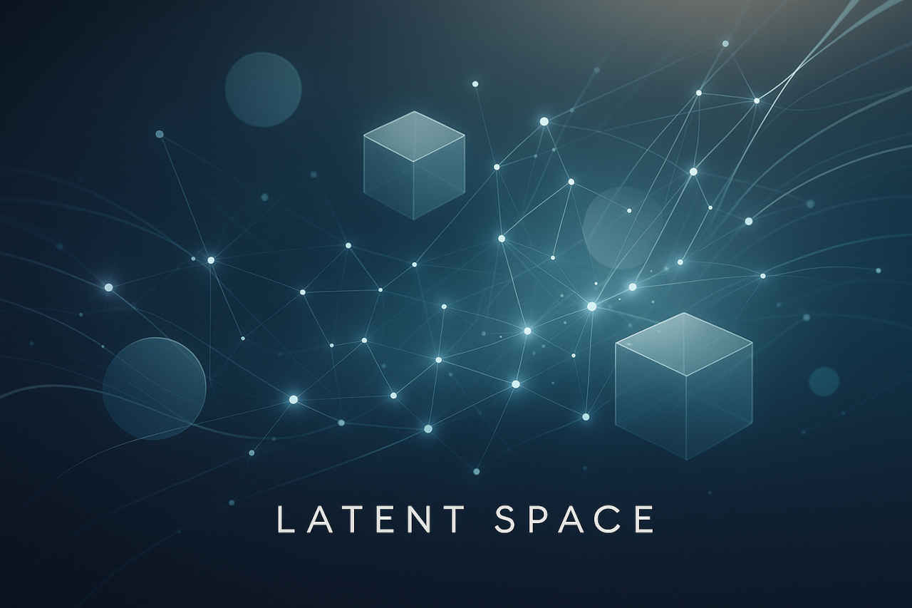 An abstract representation of a latent space, visualized as a vast digital landscape of interconnected glowing nodes, flowing data streams, and geometric patterns; soft gradients of blue, purple, and teal, creating a sense of infinite depth and intelligence; minimalistic yet futuristic design, perfect for a website header illustration, ultra-detailed, cinematic lighting, high resolution