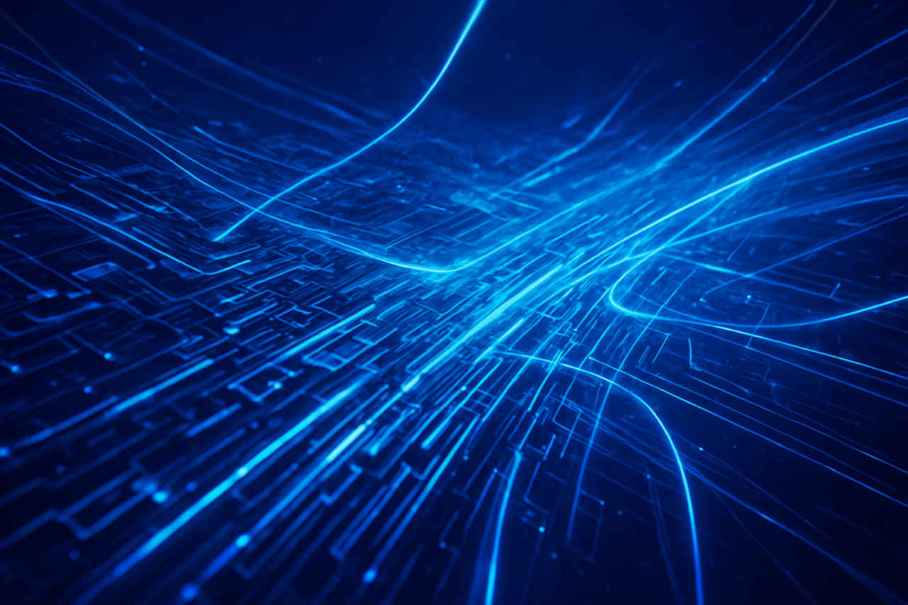 An elegant abstract digital landscape representing a latent space, composed of countless glowing blue and silver geometric lines and fragments flowing across the surface; streams of electronic light intersecting and weaving through space, symbolizing data flow and intelligence; calm and professional color palette of deep blues, silvers, and subtle cyan highlights; cinematic lighting, ultra-detailed, realistic texture, minimalistic composition, perfect for a business-oriented website header, 4k resolution