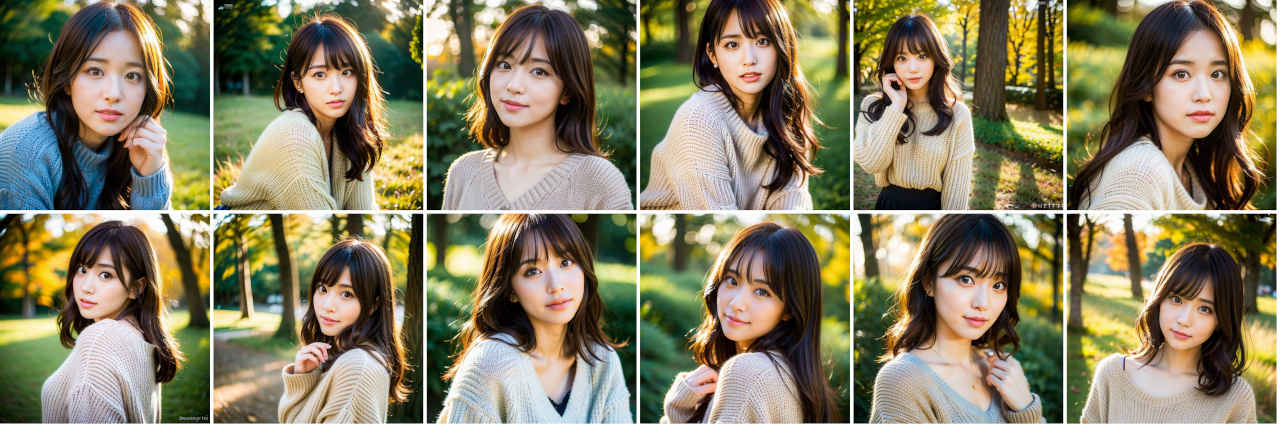 | Prompt | Photographic portrait of Japanese idol, cute face, cute eyes, sweater, skirt, SIGMA 85mm F1.4 DG DN Art, golden hour, forest, by Daniel F Gerhartz |