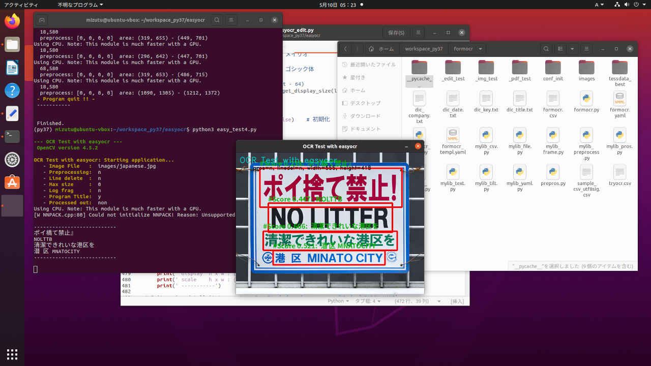 (py37) $ cd ~/workspace_py37/easyocr/ (py37) $ python3 easy_test4.py --- OCR Test with easyocr --- OpenCV version 4.5.2 OCR Test with easyocr: Starting application... - Image File : images/japanese.jpg - Preprocessing: n - Line delete : n - Max size : 0 - Log frag : n - Program Title: y - Processed out: non Using CPU. Note: This module is much faster with a GPU. [W NNPACK.cpp:80] Could not initialize NNPACK! Reason: Unsupported hardware. --------------------------- ポイ橋て禁止』 NOLTTB 清潔できれいな港区を 潜 区 MNATOCITY ---------------------------
