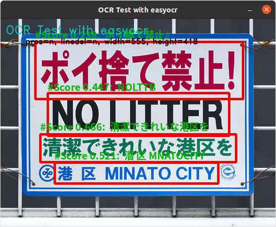 print(p0, p1, p2, p3, text, confidence)(py37) $ python3 easy_test2.py Using CPU. Note: This module is much faster with a GPU. [W NNPACK.cpp:80] Could not initialize NNPACK! Reason: Unsupported hardware. [71, 49] [489, 49] [489, 159] [71, 159] ポイ橋て禁止』 0.37951311955253036 [95, 149] [461, 149] [461, 235] [95, 235] NOLTTB 0.4456565916559547 [80, 232] [475, 232] [475, 288] [80, 288] 清潔できれいな港区を 0.6969815870208245 [109, 289] [437, 289] [437, 333] [109, 333] 潜 区 MNATOCITY 0.7553704468017064
