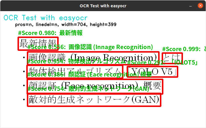 (py37) $ python3 easy_test4.py -i images/test-g.png --- OCR Test with easyocr --- OpenCV version 4.5.2 OCR Test with easyocr: Starting application... - Image File : images/test-g.png - Preprocessing: n - Line delete : n - Max size : 0 - Log frag : n - Program Title: y - Processed out: non Using CPU. Note: This module is much faster with a GPU. [W NNPACK.cpp:80] Could not initialize NNPACK! Reason: Unsupported hardware. --------------------------- ディーブラーニングは (人工知能〕 実現方法の一つである機械学晋分類される方式である_ ディーブラーニングは 人が一つひとつルールを実装するのではなく_ 生物の の一部機能を模擬したニューラルネッ ワークに基本的な学習アルゴリズムを実装し 適切なデータを与えることで コンピュータが-データの特微を自動で学 習 見つけ出し 従来手法以上に高性能な識別や処理などができるようになるものである。 学習フェーズ 現在 ディーブラーニングを活用して 画像処理 音声処理 言語処理 予測処理などが従来手法よりも大きな成果を 上げているが 現時点では学習に必雲なアルゴリズムやブラットホームは発展途上にあり_ 用途による向き不向きや _ 勝手の良しあし 精度と処理速度などが大きく異なる ディーブラーニングで学晋させるためには大きなマシンバワー が必要であり 実装は容易ではなし 推論フェーズ 部の学習結果について オーブンソース・モデルとして 事前学習済みモデルと呼ばれるディーブラーニング学習済 みの結果が公開されている の学習済みモデルを利用すると カメラ画像やビデオデーター 写真データなどに対して比 軟的容易に画像認識や音声認識などを行うことが可能になる_ ---------------------------・その他のサンプル