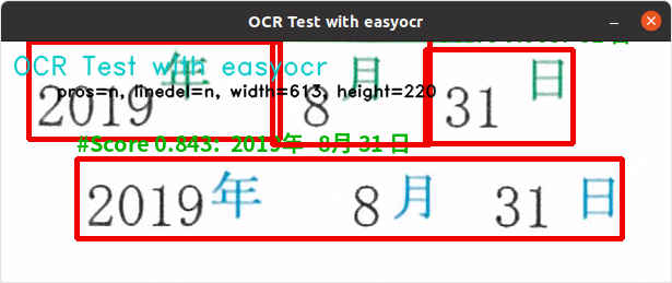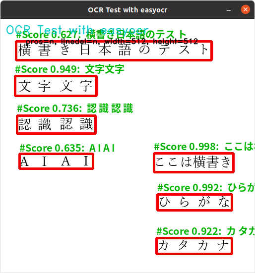print(p0, p1, p2, p3, text, confidence)(py37) $ python3 easy_test3.py Using CPU. Note: This module is much faster with a GPU. [W NNPACK.cpp:80] Could not initialize NNPACK! Reason: Unsupported hardware. [70, 46] [489, 46] [489, 161] [70, 161] ポイ橋て禁止』 0.23787610630466707 [95, 149] [461, 149] [461, 235] [95, 235] NOLTTB 0.4473010669317903 [80, 232] [475, 232] [475, 288] [80, 288] 清潔できれいな港区を 0.6657611839453549 [109, 289] [439, 289] [439, 331] [109, 331] 潜 区 MNATOCITY 0.5209840622583983
