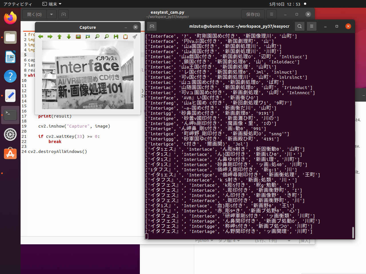 cv2.destroyAllWindows()(py37) $ python3 easytest_cam.py Using CPU. Note: This module is much faster with a GPU. [W NNPACK.cpp:80] Could not initialize NNPACK! Reason: Unsupported hardware. ['Interiac', 'Aは国めC付き', '新画劇処理', '川町', '山りロe'] ['Interfac', '山~鹿国め CD付き', '新画劇処理1', '川町', '川りocr'] ['Interfac', '山av国C付き', '新画劇処理', '川町', 'rりuc'] ['Interfac', 'Aんv国め C付き', '新画劇理1', '山', '田ワワにし'] ['Interfac', '山av国C付き', '新画劇理', '一19', 'りこ'] :