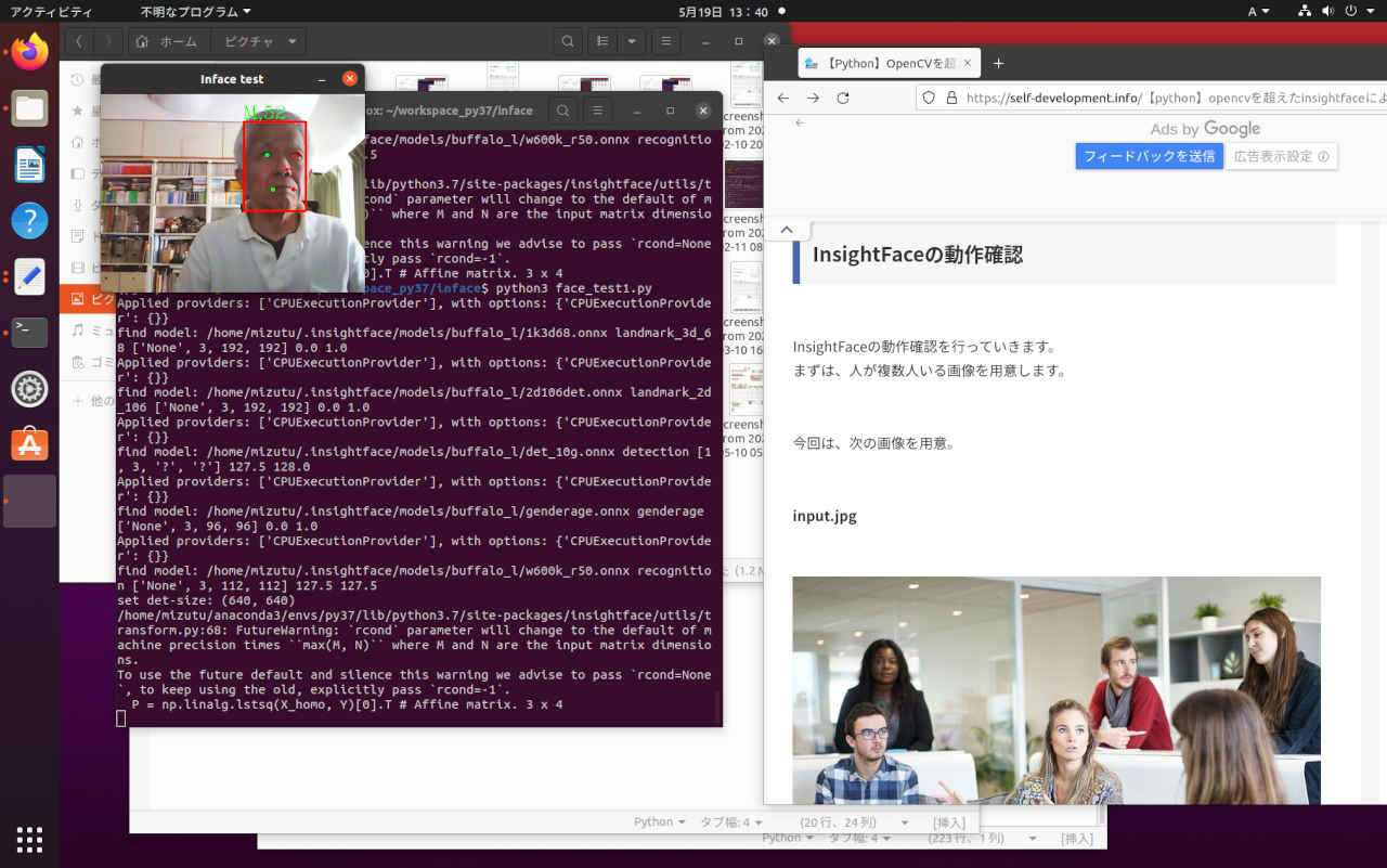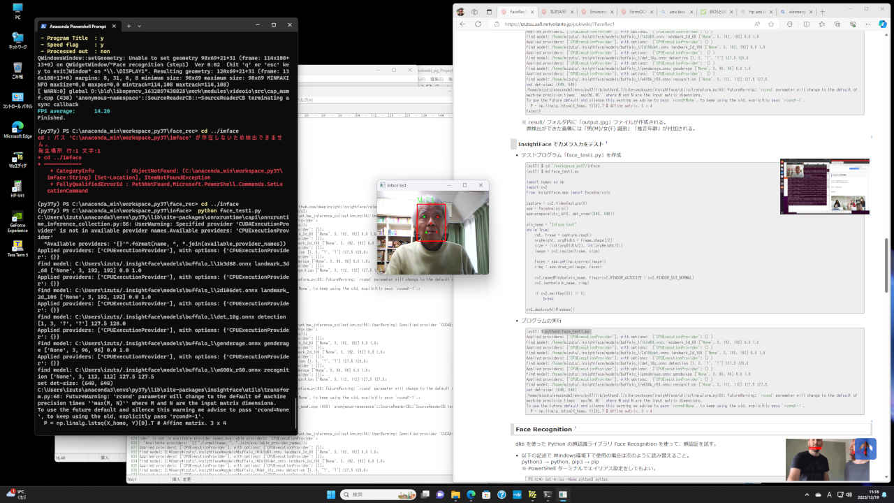 cv2.destroyAllWindows()(py37y) PS > python face_test1.py Applied providers: ['CPUExecutionProvider'], with options: {'CPUExecutionProvider':{}} find model: /home/mizutu/.insightface/models/buffalo_l/1k3d68.onnx landmark_3d_68 ['None', 3, 192, 192] 0.0 1.0 Applied providers: ['CPUExecutionProvider'], with options: {'CPUExecutionProvider':{}} find model: /home/mizutu/.insightface/models/buffalo_l/2d106det.onnx landmark_2d_106 ['None', 3, 192, 192] 0.0 1.0 Applied providers: ['CPUExecutionProvider'], with options: {'CPUExecutionProvider':{}} find model: /home/mizutu/.insightface/models/buffalo_l/det_10g.onnx detection [1, 3, '?', '?'] 127.5 128.0 Applied providers: ['CPUExecutionProvider'], with options: {'CPUExecutionProvider':{}} find model: /home/mizutu/.insightface/models/buffalo_l/genderage.onnx genderage ['None', 3, 96, 96] 0.0 1.0 Applied providers: ['CPUExecutionProvider'], with options: {'CPUExecutionProvider':{}} find model: /home/mizutu/.insightface/models/buffalo_l/w600k_r50.onnx recognition ['None', 3, 112, 112] 127.5 127.5 set det-size: (640, 640) /home/mizutu/anaconda3/envs/py37/lib/python3.7/site-packages/insightface/utils/transform.py:68: FutureWarning: `rcond` parameter will change to the default of machine precision times ``max(M, N)`` where M and N are the input matrix dimensions. To use the future default and silence this warning we advise to pass `rcond=None`, to keep using the old, explicitly pass `rcond=-1`. P = np.linalg.lstsq(X_homo, Y)[0].T # Affine matrix. 3 x 4