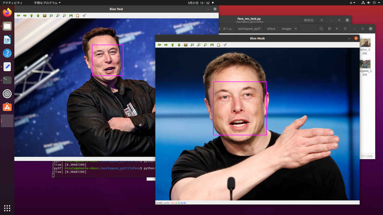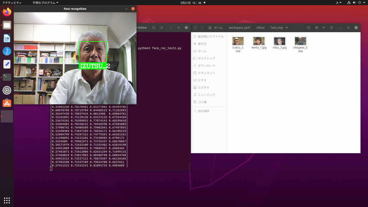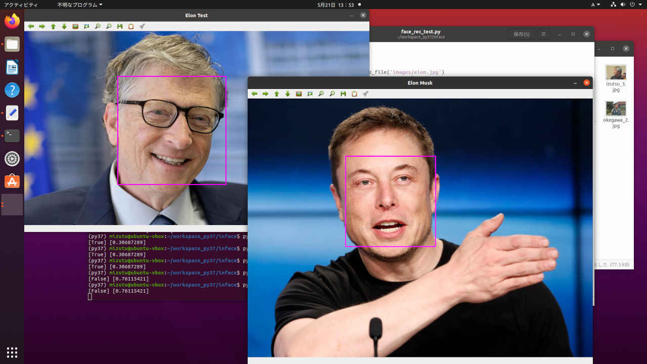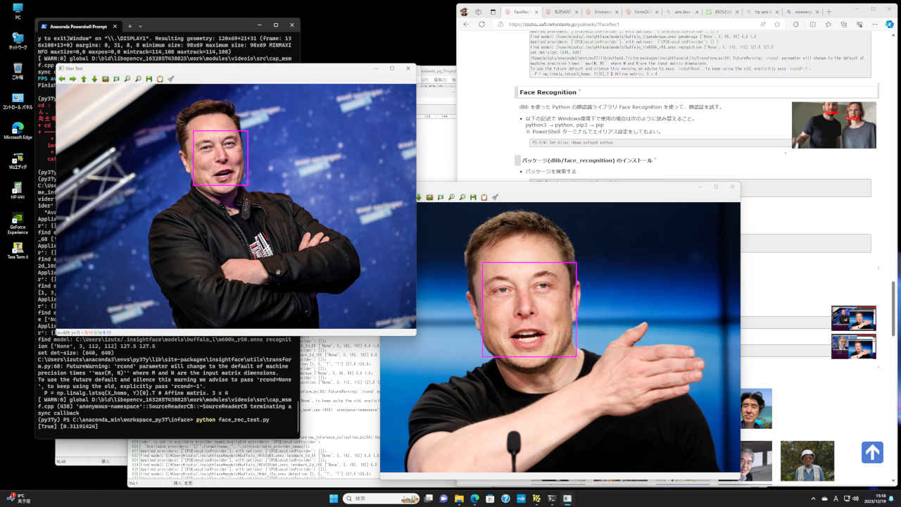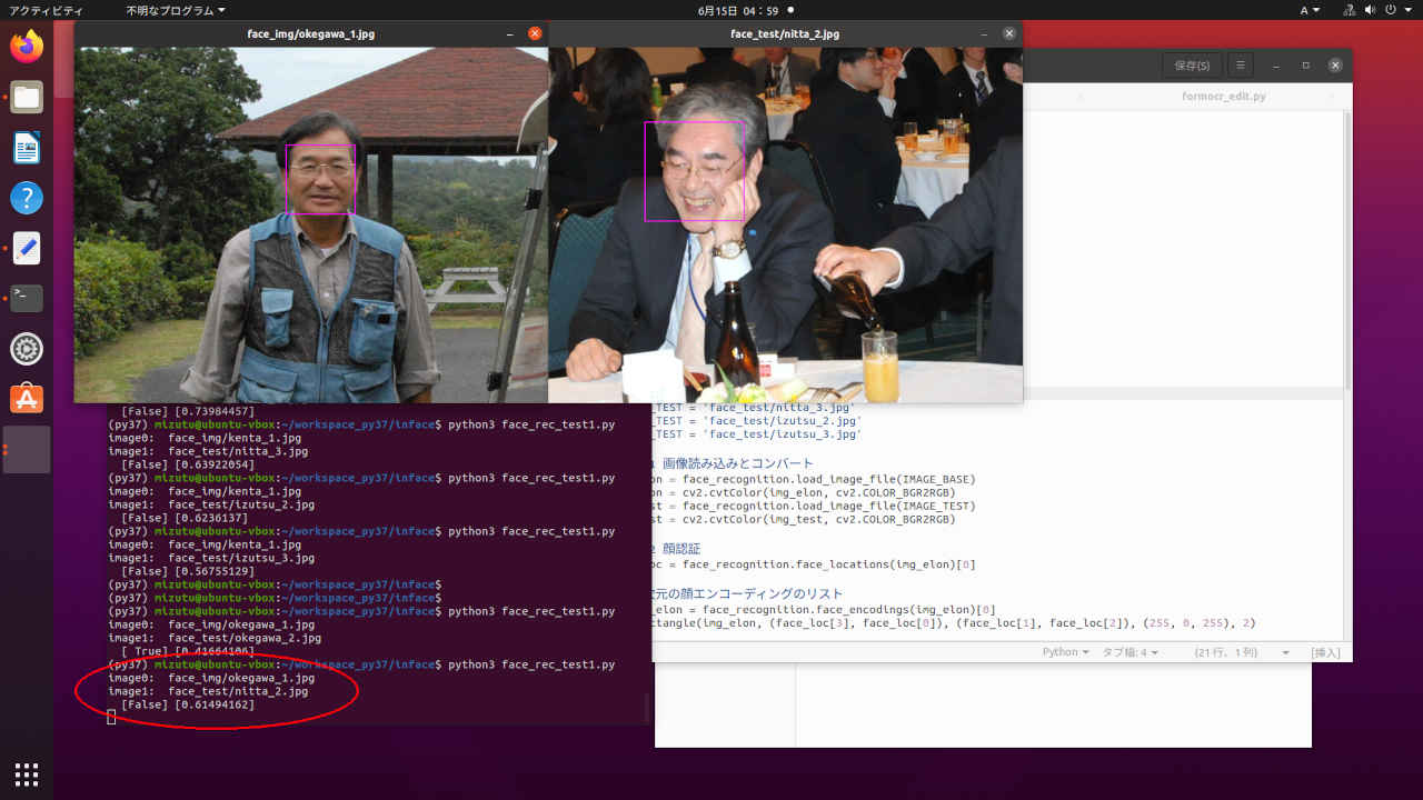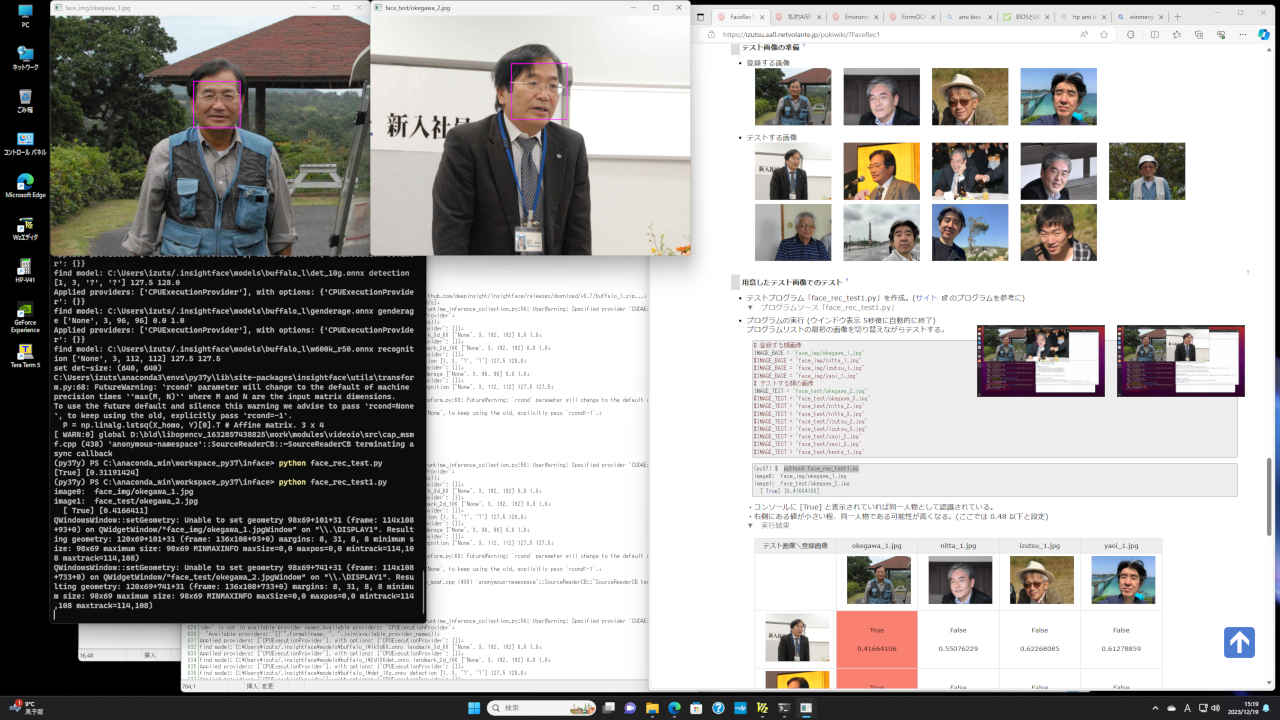 (py37y) PS > python face_rec_test1.py image0: face_img/okegawa_1.jpg image1: face_test/okegawa_2.jpg [ True] [0.41664106]・コンソールに [True] と表示されていれば同一人物として認識されている。