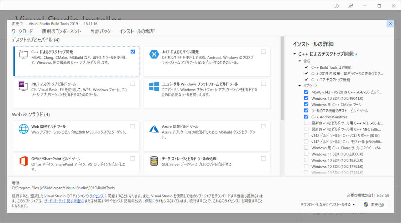 error: Microsoft Visual C++ 14.0 or greater is required. Get it with "Microsoft C++ Build Tools": https://visualstudio.microsoft.com/visual-cpp-build-toolsインストール時に上記のメッセージでエラーとなる場合