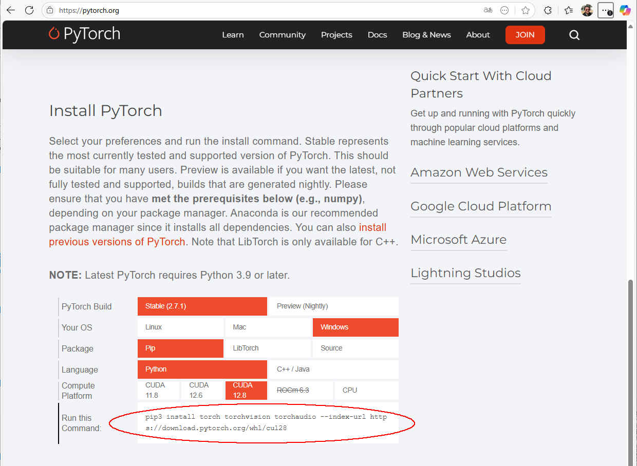 (py38_learn) pip install torch torchvision torchaudio --index-url https://download.pytorch.org/whl/cu121 ← GPU の場合 (2024.09.01)