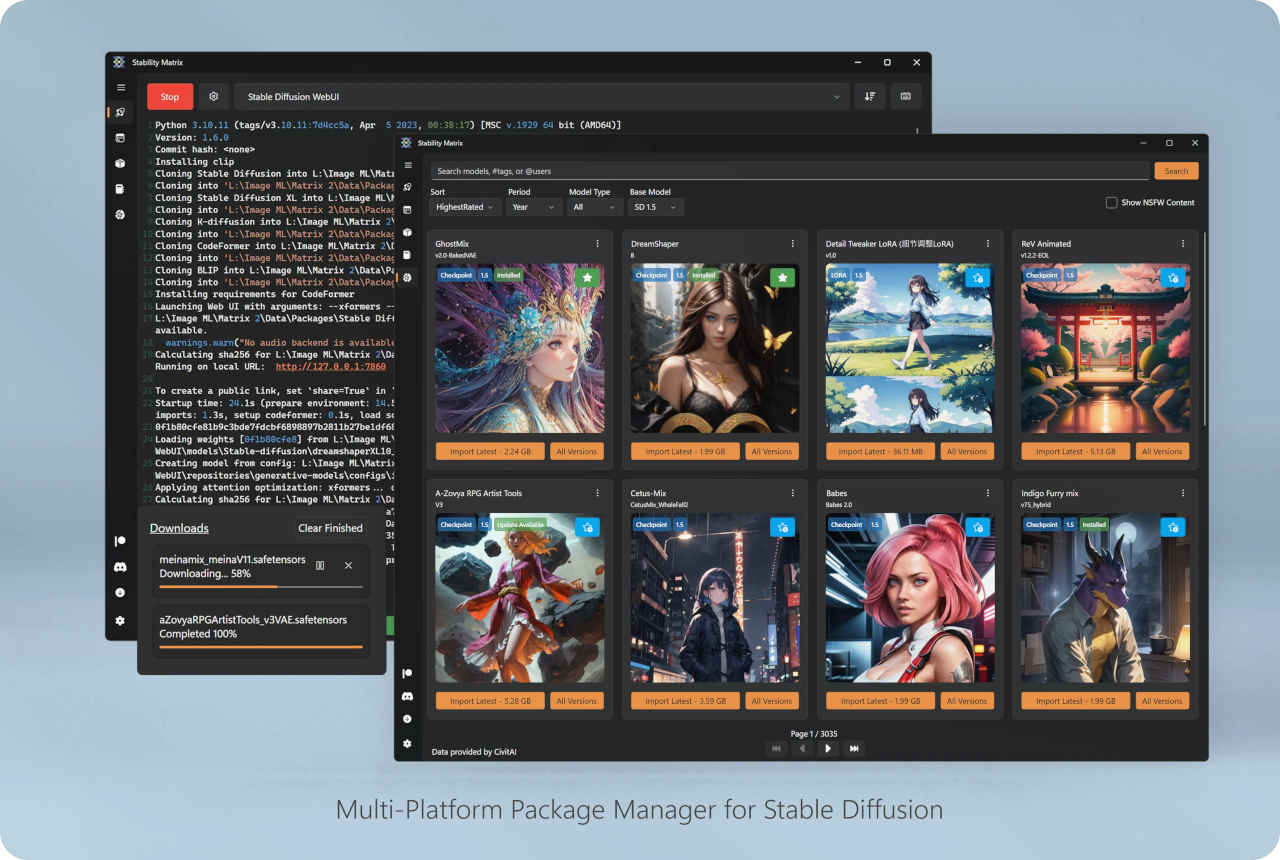 :\(ドライブ・ルート) ├─anaconda_win/ │ ├─workspace_3/ │ │ ├─sd_test/ ← プロジェクトの実行フォルダ : ├─StabilityMatrix/ │ └─Data/ │ ├─Models/ │ │ ├─StableDiffusion/ │ │ │ ├─SD1.5/ ← SD1.5 モデルの場所 │ │ │ └─・・・・・・ ← SDXL モデルの場所・「workspace_3/sd_test/」フォルダが配置されているドライブ直下に「StabilityMatrix」フォルダが存在すること