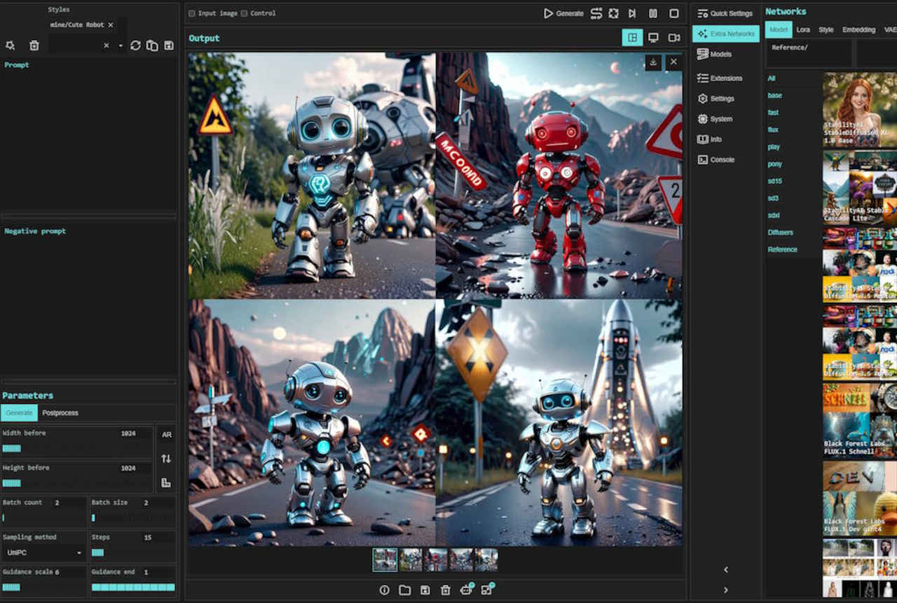 ![]() | Stable Diffusion WebUI reForge | SD1.5 SDXL | Forge の後継。軽量化と生成速度の速さなどの Forge の特徴を引き継ぎ活動も活発。派生元の Automatic1111 版とほぼ同じUIで使いやすい https://github.com/Panchovix/stable-diffusion-webui-reForge | 活発 v1.7.0d |