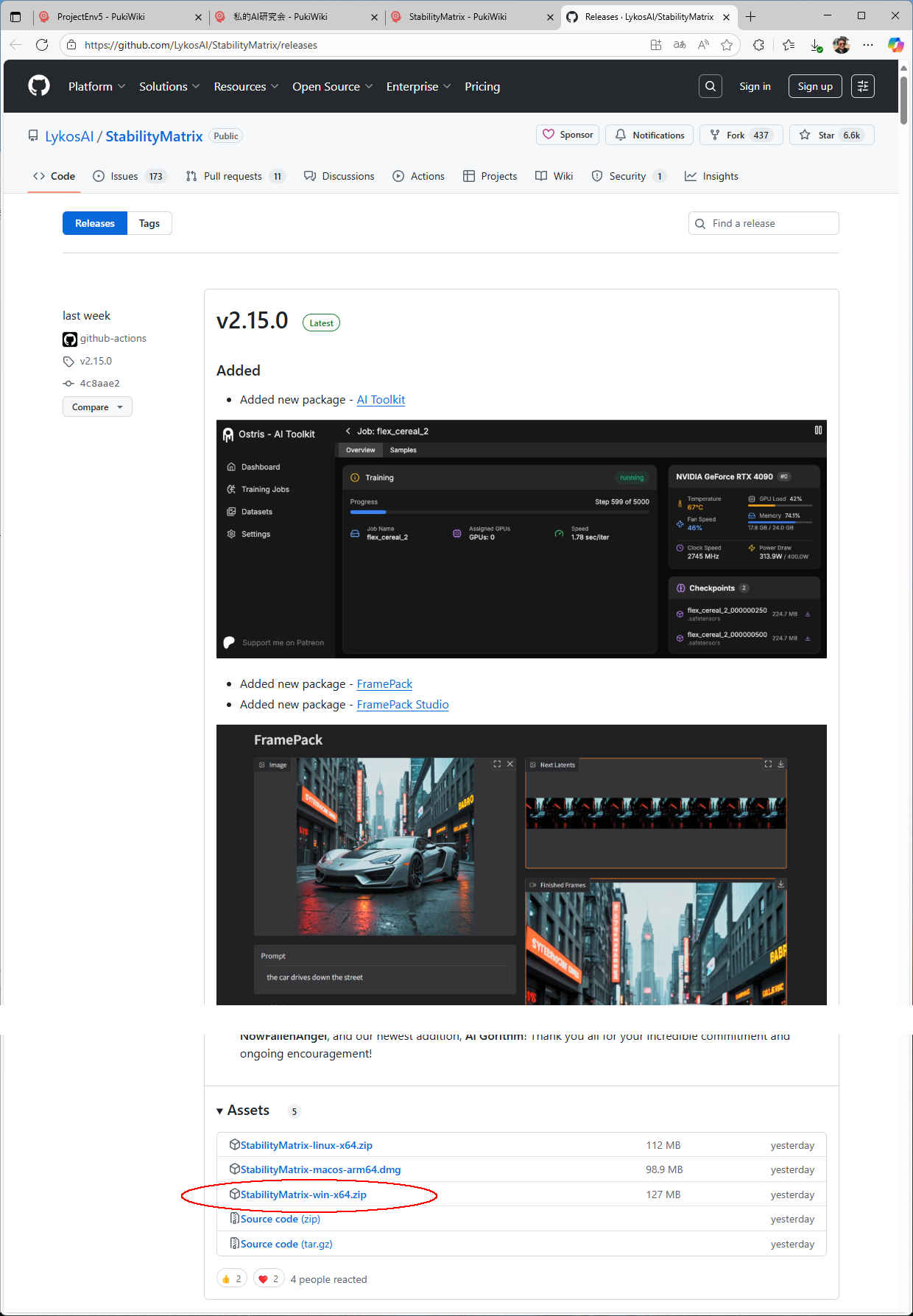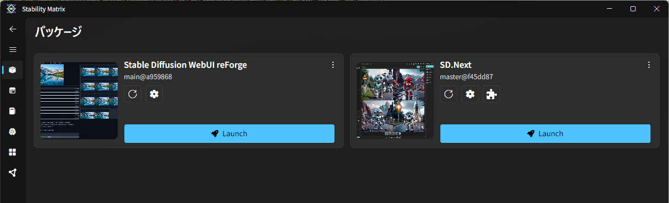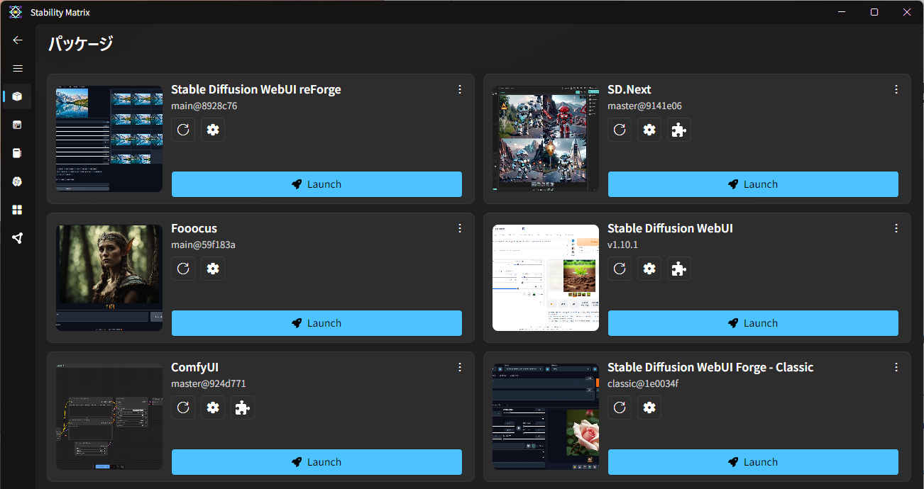 ![]() | StabilityMatrix | SD1.5 SDXL | 「Automatic1111」「reForge」「SDNext」「Fooocus」「ComfyUI」など多数の Stable Diffusion 環境に対応し、事前のパッケージ・インストールや環境構築が不要。複数の Stable Diffusion 環境間でモデルファイルを共有することができる https://github.com/LykosAI/StabilityMatrix | 活発 v2.15.0 |