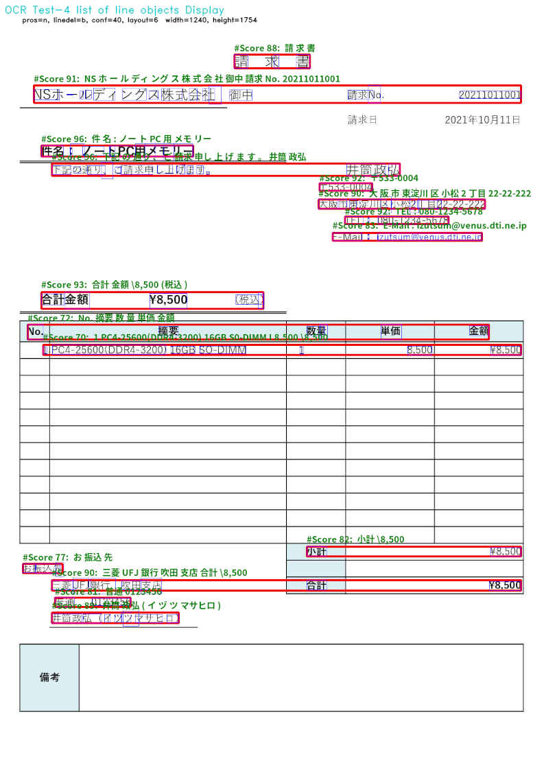 (py37) $ python3 ocrtest4.py -i [サンプルファイル名] -d b -o ./result/[結果出力ファイル名] --- OCR Test-4 list of line objects Display --- OpenCV version 4.5.2 OCR Test-4 list of line objects Display: Starting application... - Image File : [ファイル名] - Language : jpn - Preprocessing: n - Line delete : b - Confidence : 40 - Layout : 6 - Max size : 0 - Log frag : n - Program Title: y - Processed out: ./result/[結果出力ファイル名] :※ 画像をクリックすると拡大表示