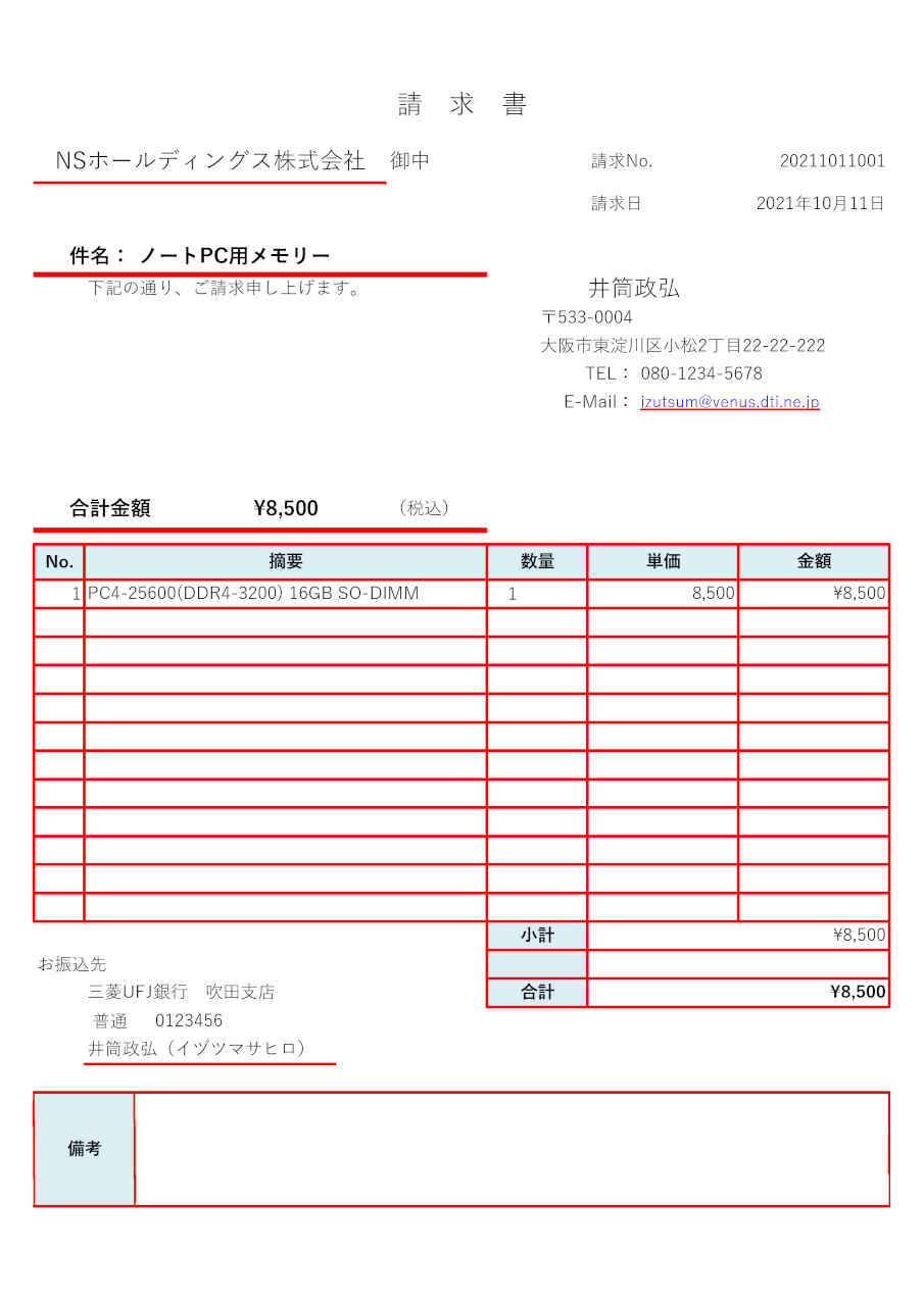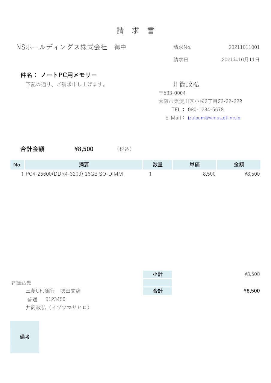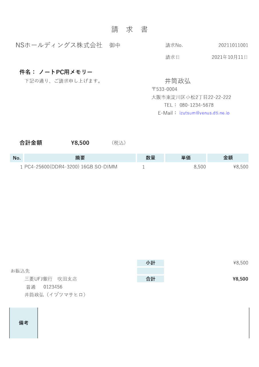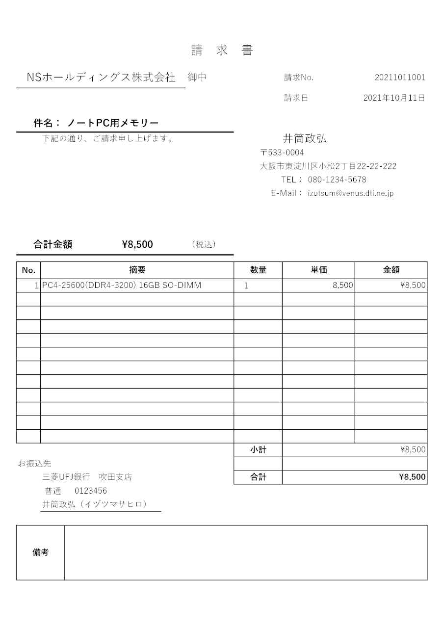 | 'sample1.png' PNG 300dpi 仮想プリンタに出力した画像 (参考:A4サイズ 2479x3508pixel) | 92: 請 求 書 90: NS ホ ー ル ディ ング ス 株 式 会 社 御中 請求 No. 20211011001 83: 請求 日 2021 年 10 月 11 日 96: 件 名: ノー ト PC 用 メモ リー 79: 下記 の 通り 、 ご 請求 申し 上 げ ま す 。 井筒 政弘 91: 〒533-0004 91: 大 阪 市 東淀川 区 小松 2 丁目 22-22-222 91: TEL : 080-1234-5678 65: E-Mail : izutsum@venus.dti.ne.ip 92: 合計 金額 \8,500 (税込 ) 91: No. 摘要 数 量 単価 金額 91: 1 PC4-25600(DDR4-3200) 16GB SO-DIMM 1 8.500 \8.500 86: 小計 \8.500 92: お 振込 先 86: 三菱 UFJ 銀行 吹田 支店 合計 \8,500 65: 普通 0123456 93: 井筒 政弘 ( イ ヅ ツ マサ ヒロ ) 96: 備考 | ||