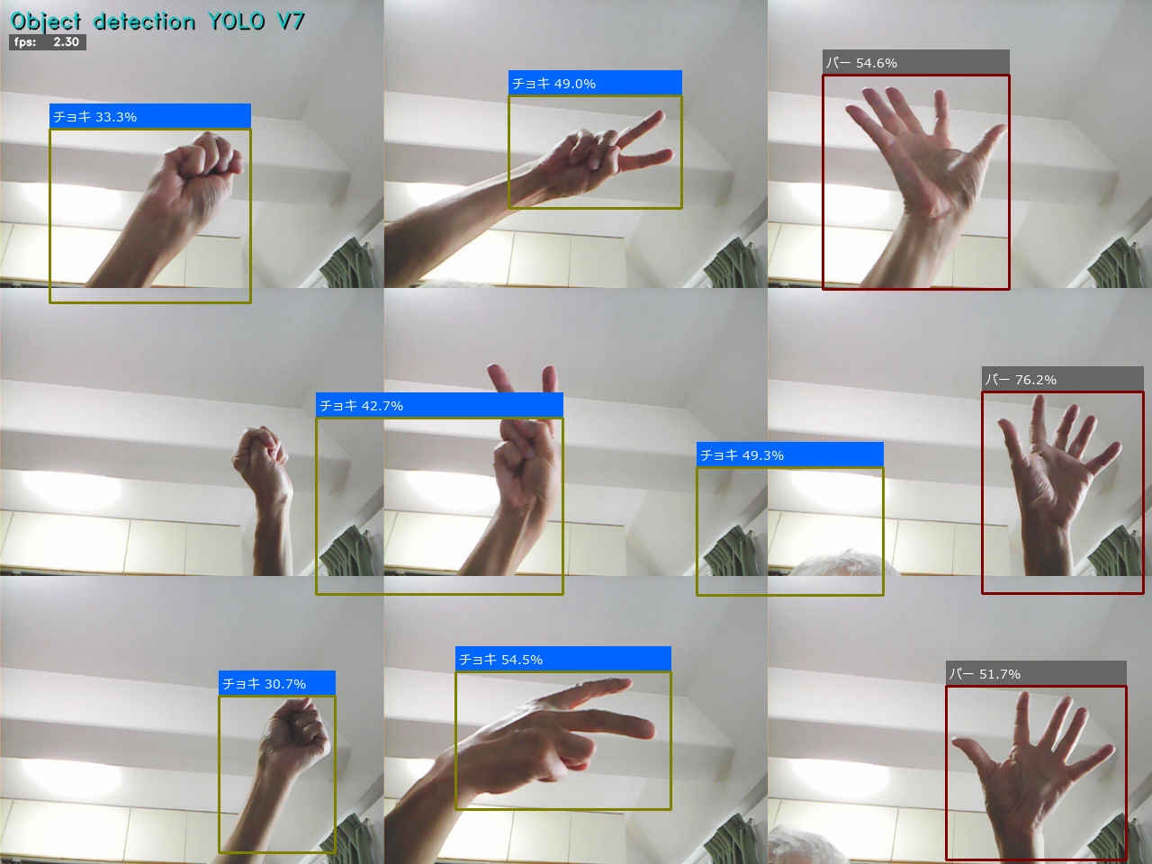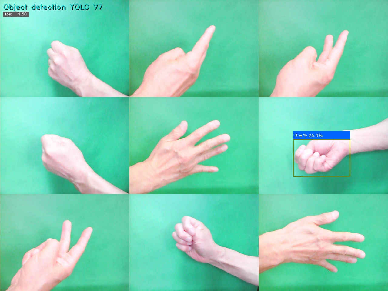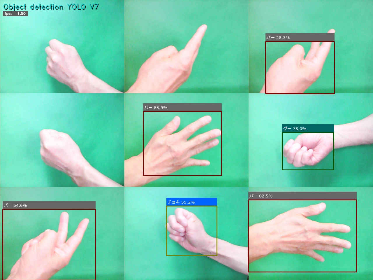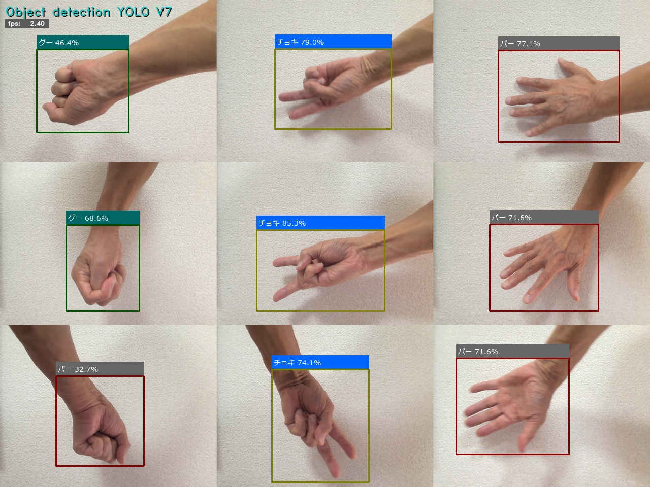 | janken_test.mp4 | python object_detect_yolo7.py -m ../yolov7-main/runs/train/yolov7x_custom4_60/weights/best.onnx -l janken.names_jp -i ../../Videos/janken_test.mp4 -d GPU |