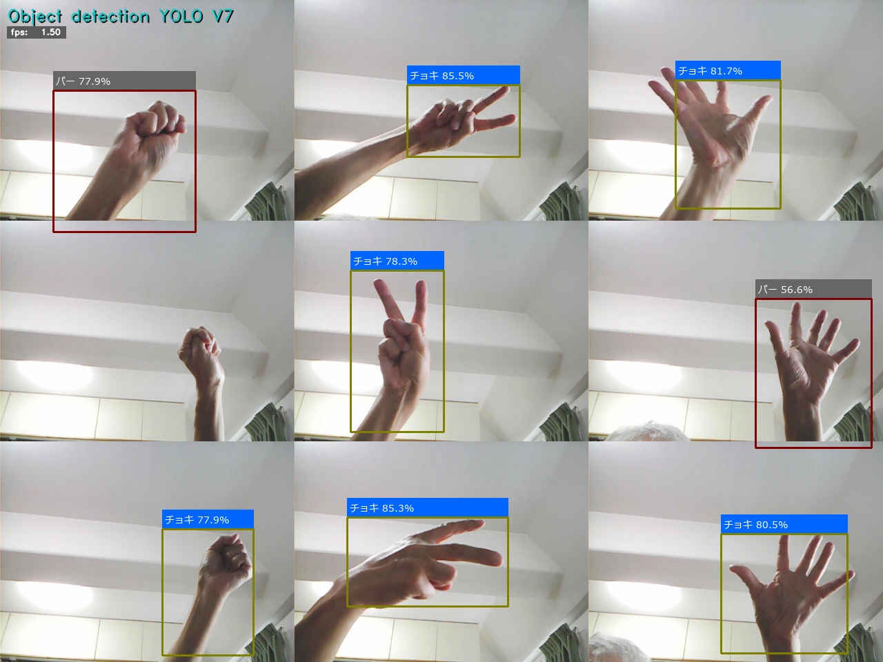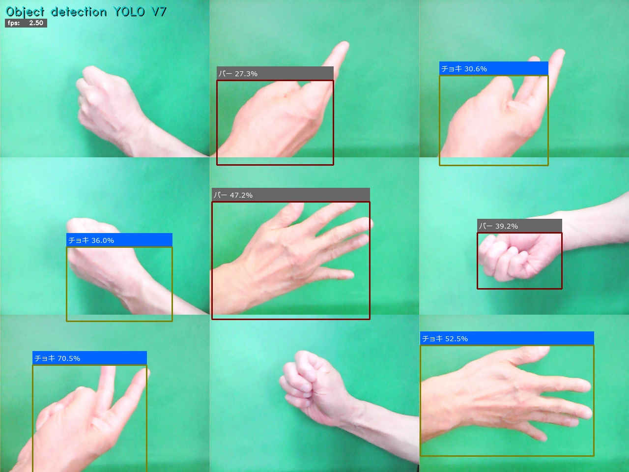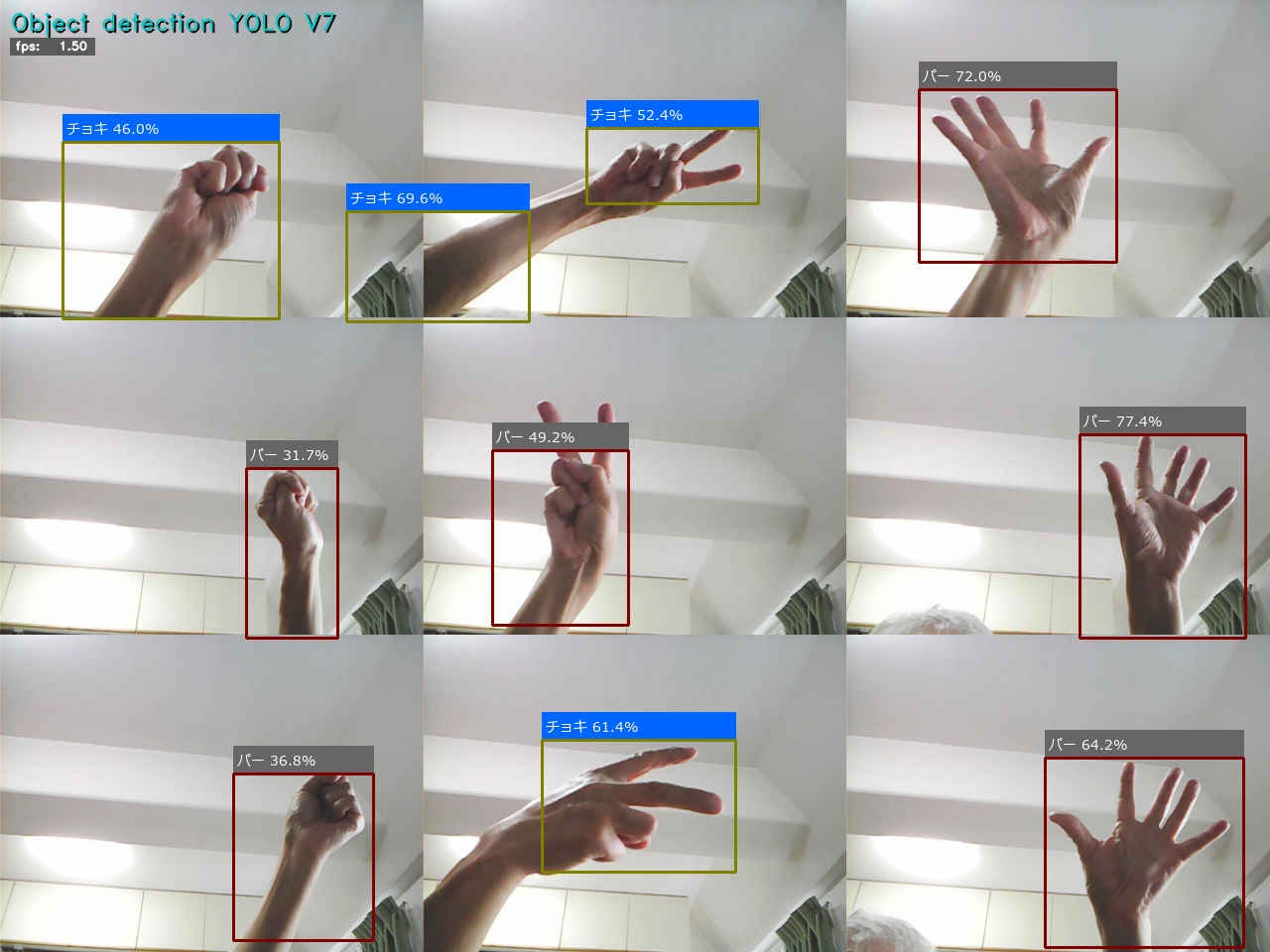 | janken_test.mp4 | python object_detect_yolo7.py -m ../yolov7-main/runs/train/yolov7x_custom4_60/weights/best.onnx -l janken.names_jp -i ../../Videos/janken_test.mp4 -d GPU |
