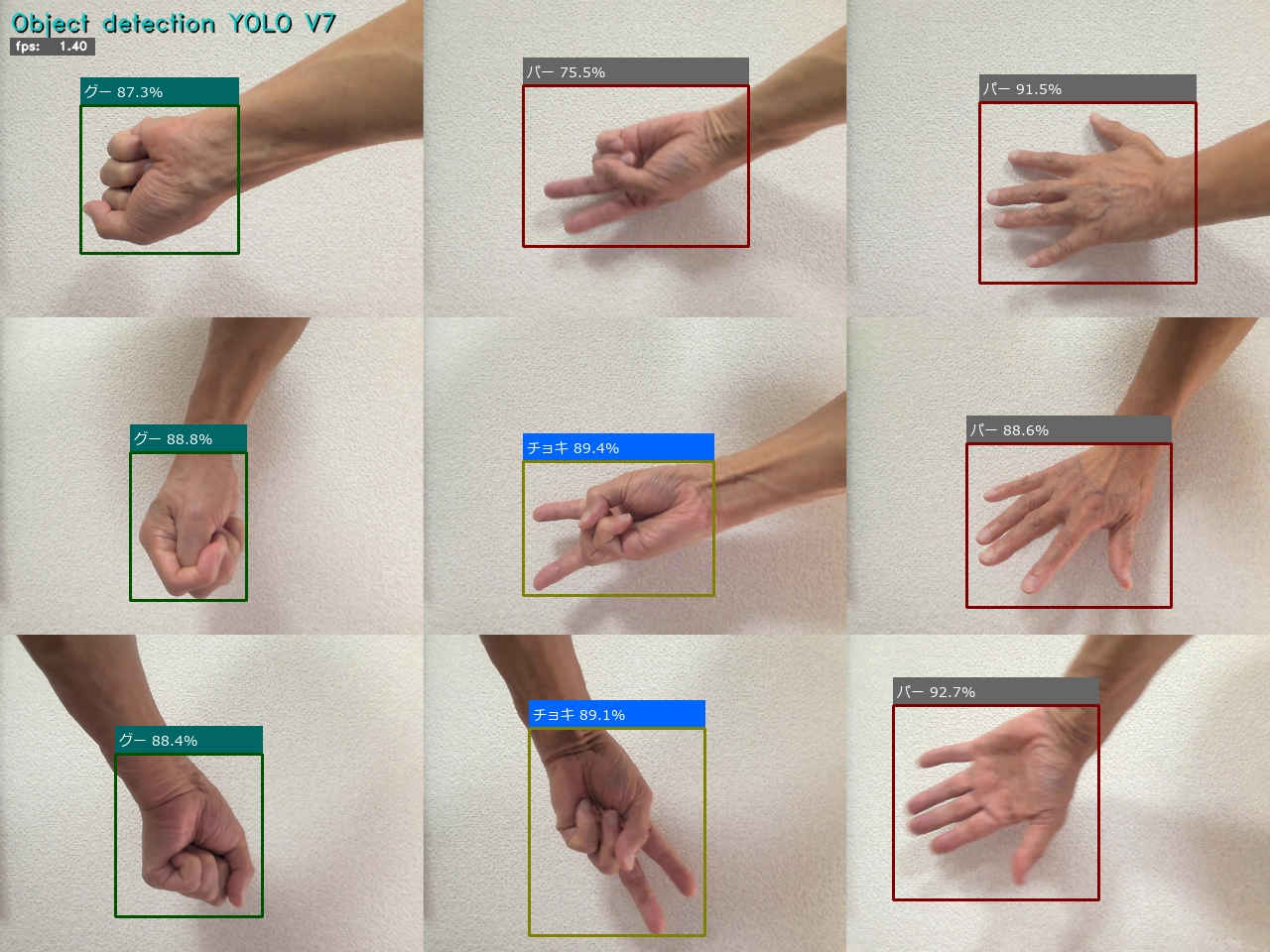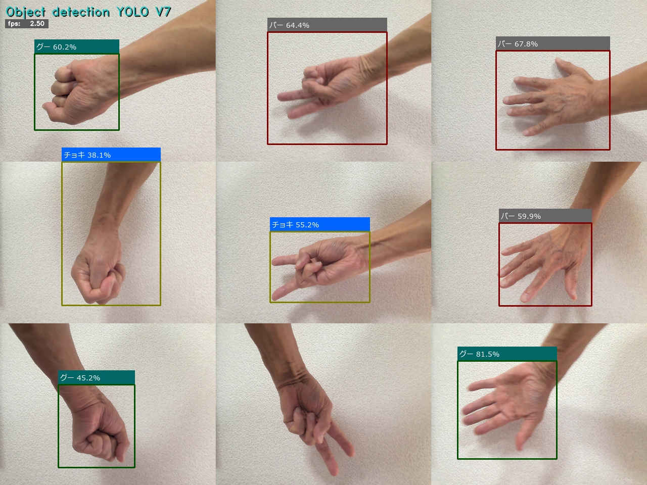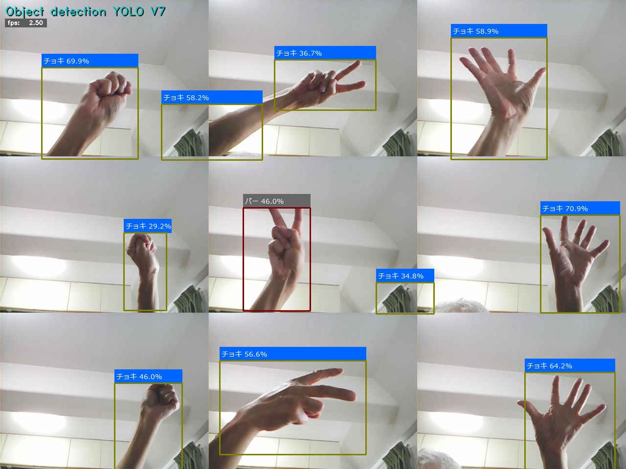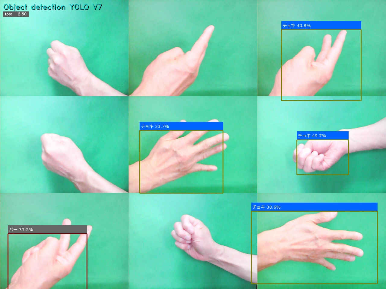 | janken_test.mp4 | python object_detect_yolo7.py -m ../yolov7-main/runs/train/yolov7x_custom4_60/weights/best.onnx -l janken.names_jp -i ../../Videos/janken_test.mp4 -d GPU |