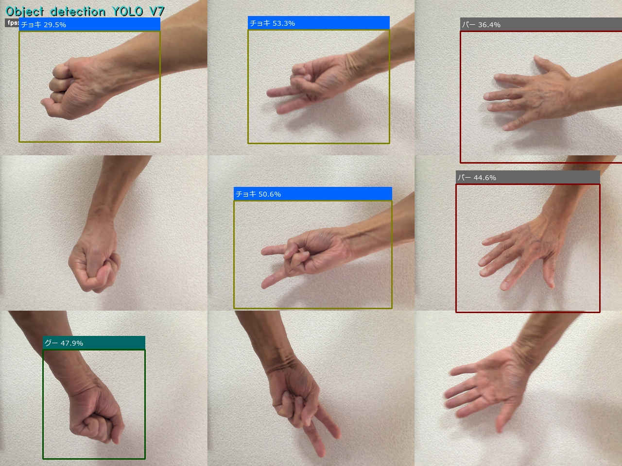 | カメラ画像 | python object_detect_yolo7.py -m ../yolov7-main/runs/train/yolov7-tiny_jk4/weights/best.onnx -l janken.names_jp -i cam -d GPU | - |