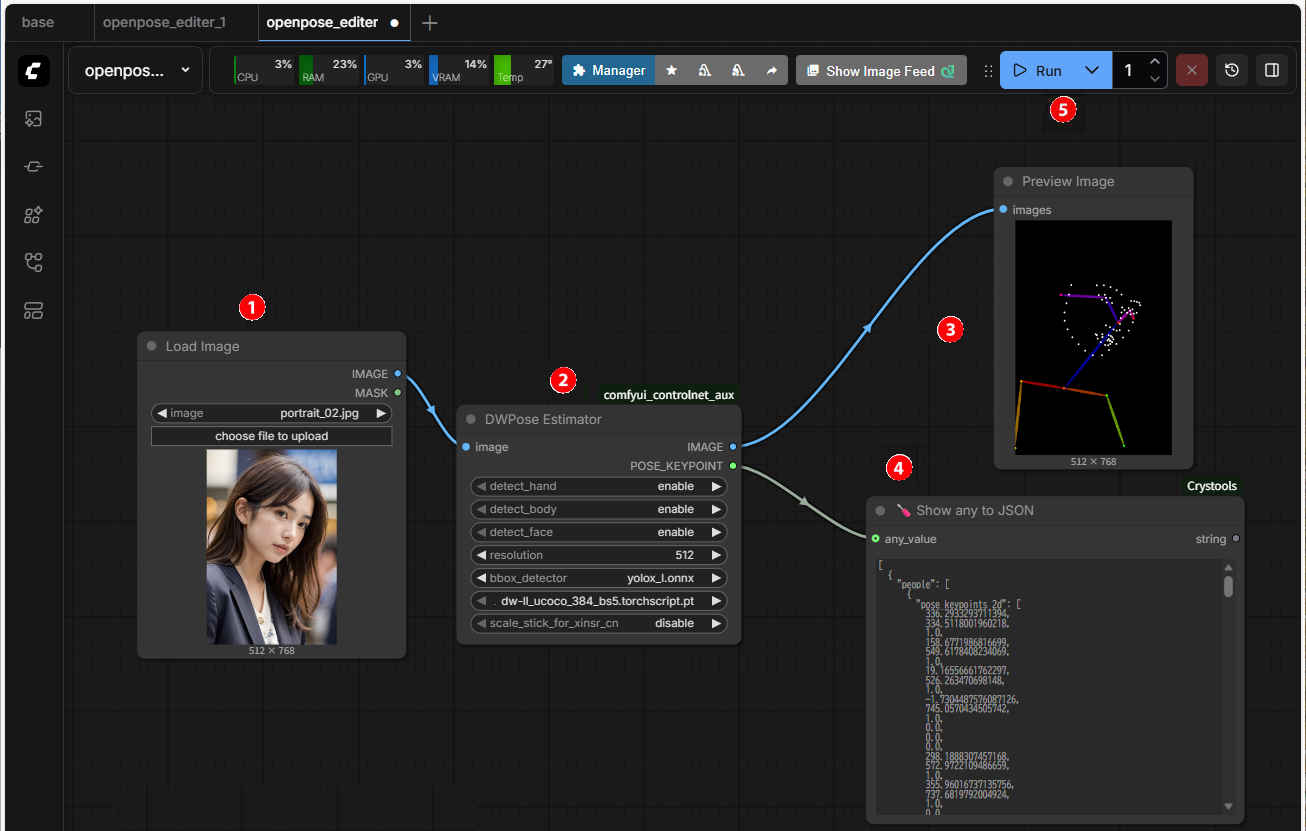 ⑤「Run」を押して実行するとポーズ画像と JSON テキストが得られる