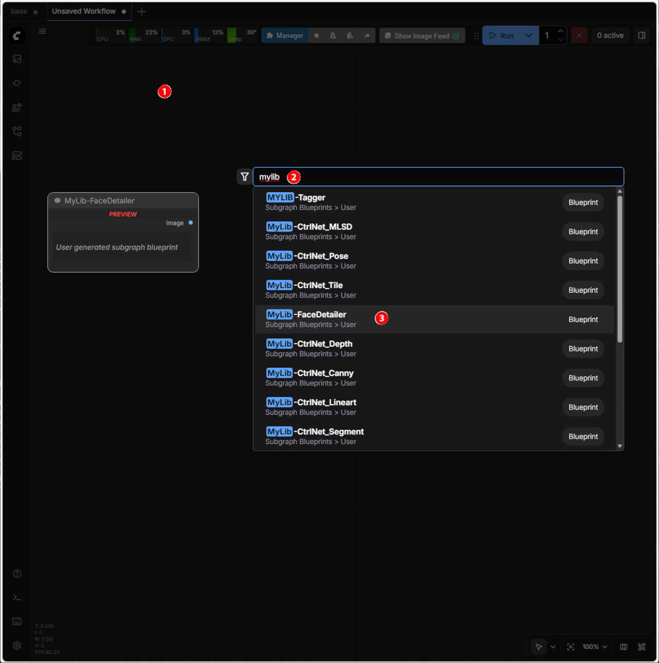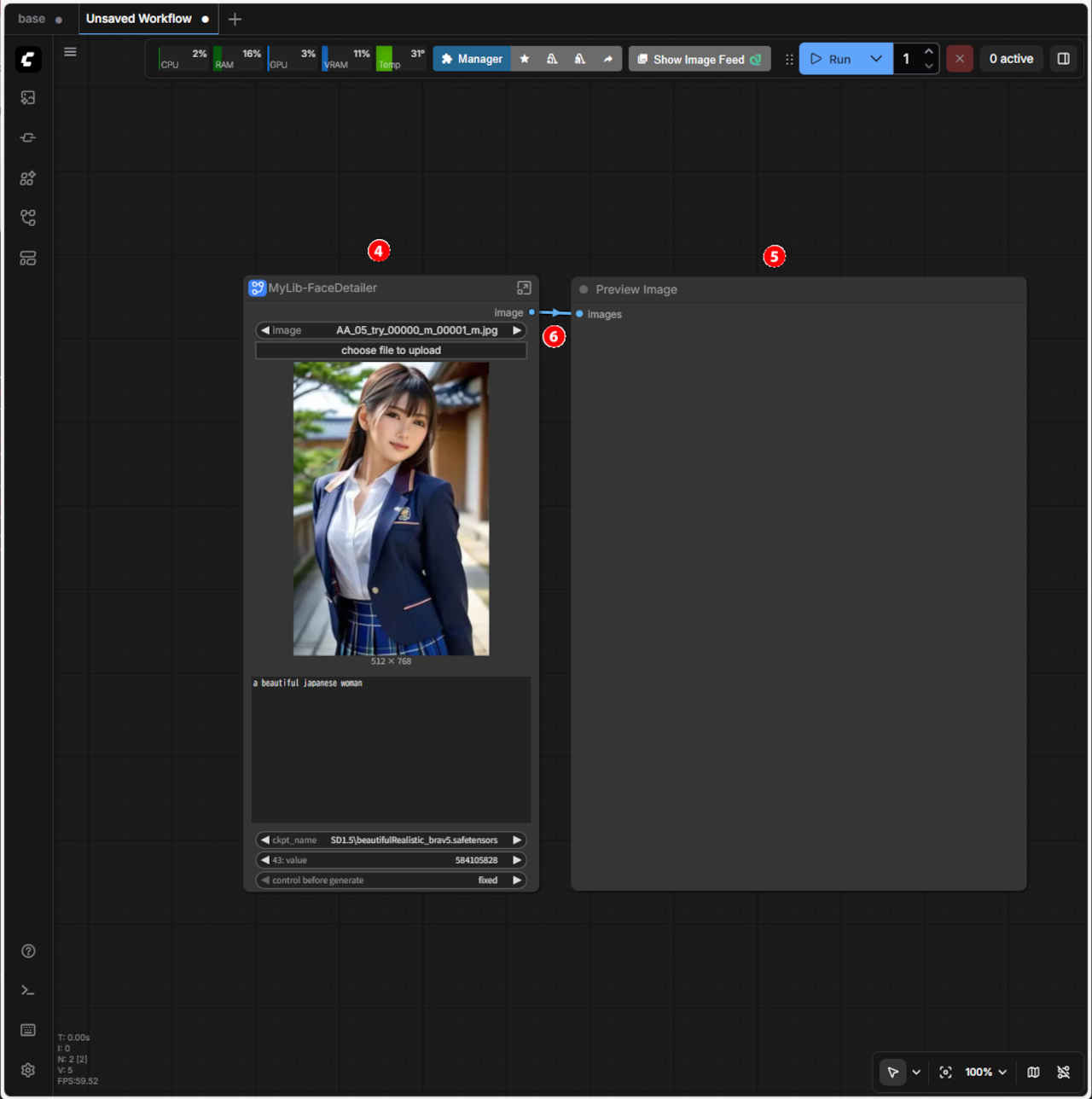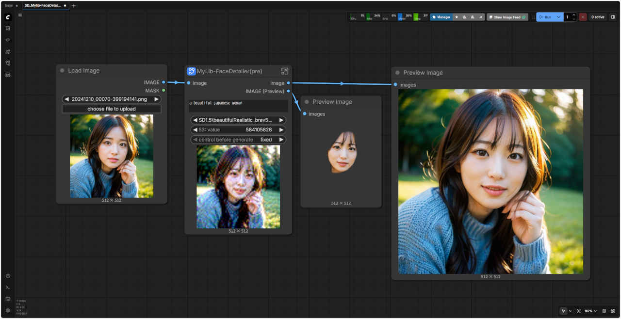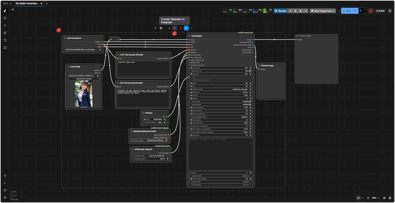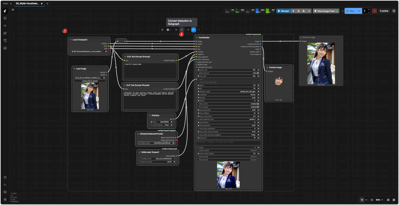 | 顔を修正するワークフロー「FaceDetailer」 を「SubGraph」化する。入力画像を外部から接続する形式にする |