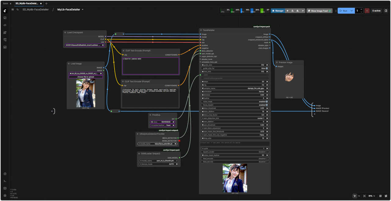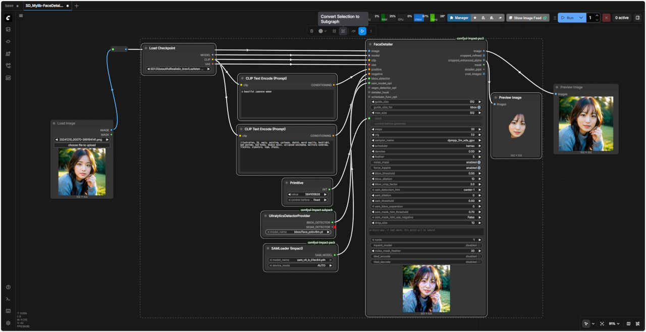 | 顔を修正するワークフロー「FaceDetailer」 を「SubGraph」化してみる。入力画像をドラッグ&ドロップする形式にする |