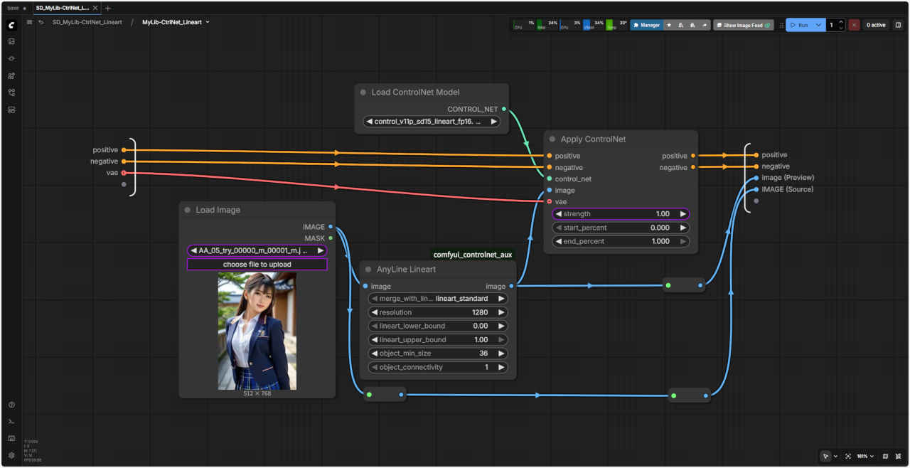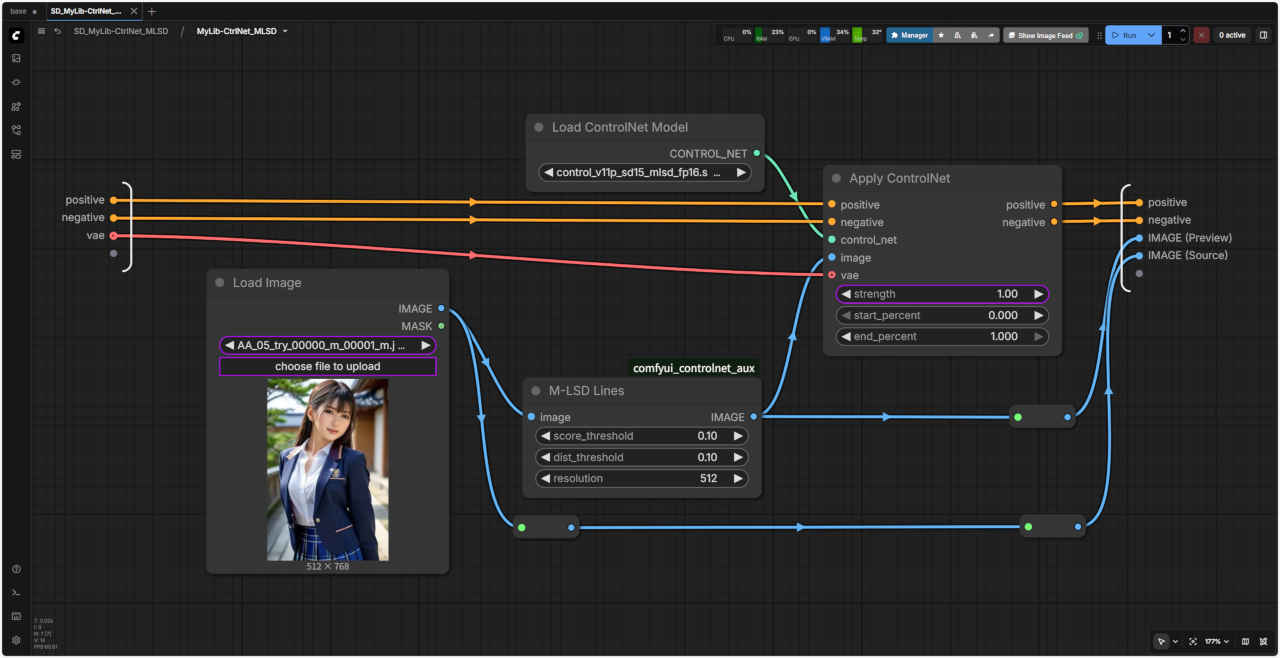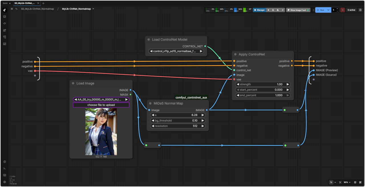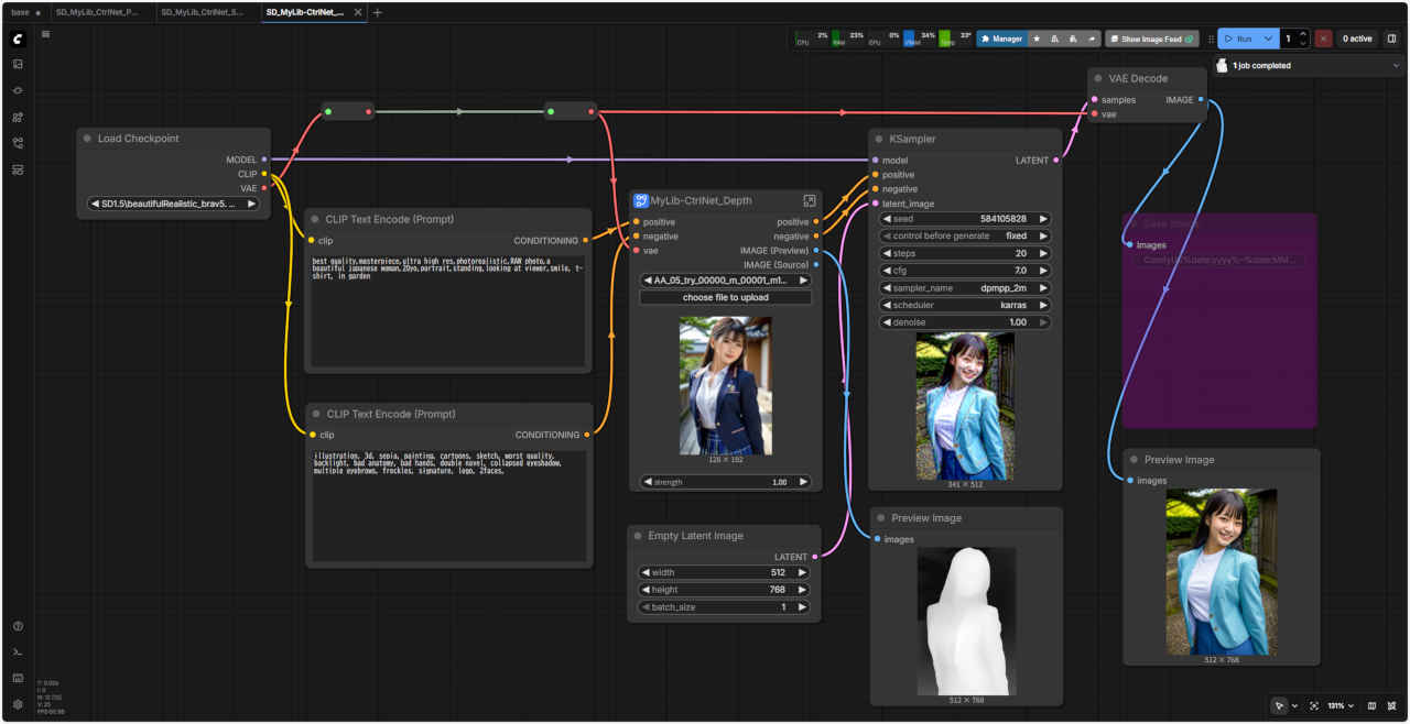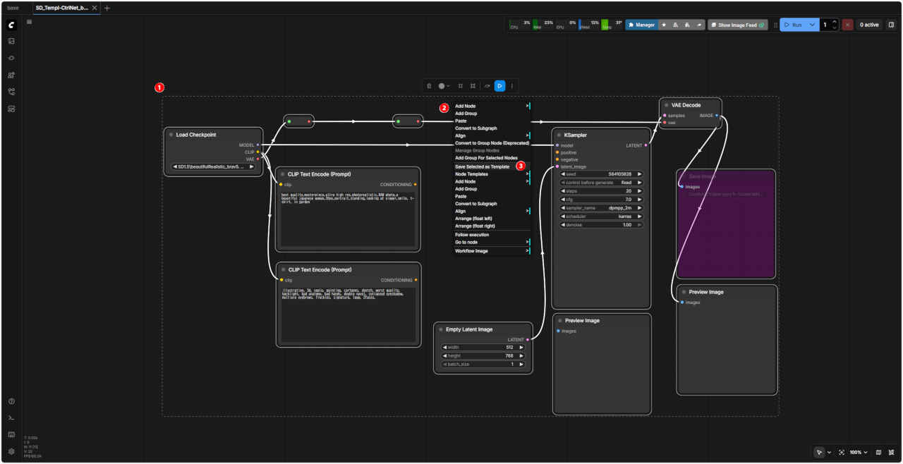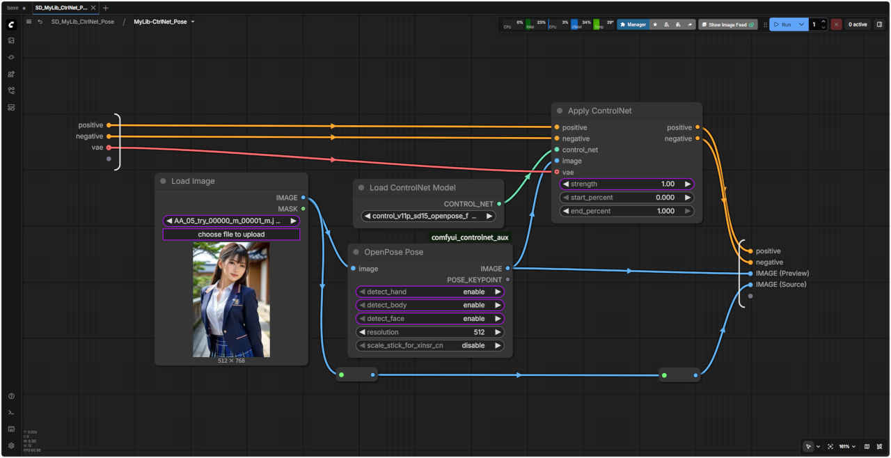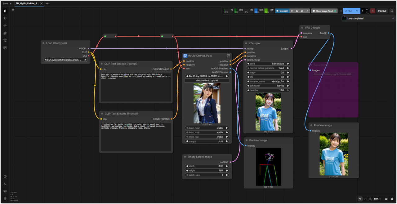 | 「ComfyUI」で『ControlNet』を使用する ワークフローの『ControlNet』で使用する基本ノードを「SubGraph」化したノード テンプレート SD_CtlNet_base にはめ込む形で同じように利用することができる |