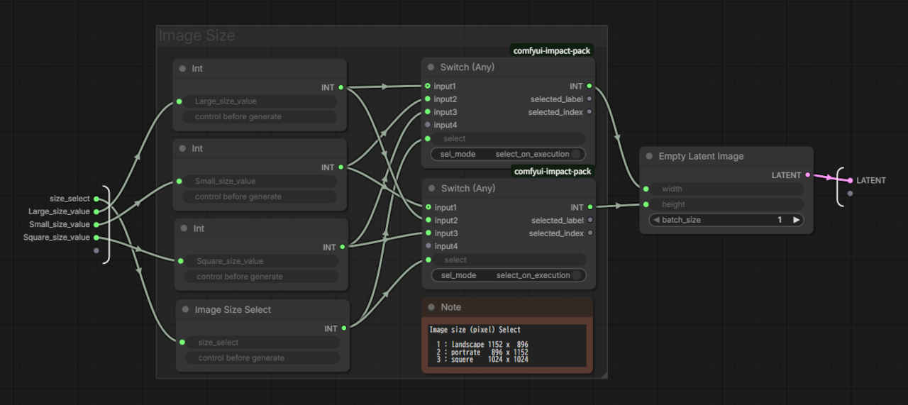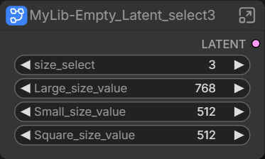 | 空の潜在空間を出力するノード あらかじめ「長辺・短辺・正方形の辺」の数値を乳井力して置クことで、セレクト値(1 ~ 3)の入力で縦横比の切り替えが簡単にできる |