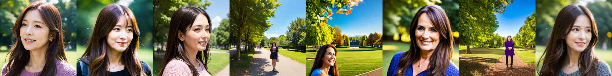 | P2 | profile picture of a happy middle aged woman with long brown hair standing outside in a sunny park with trees in the background, digital art |