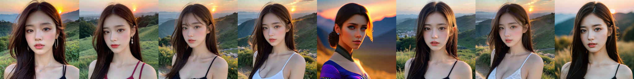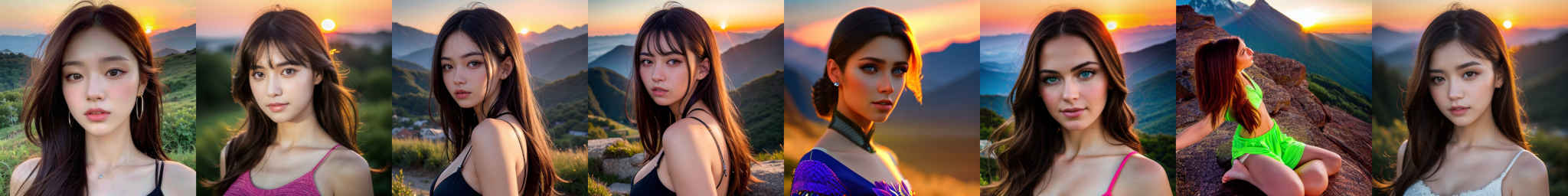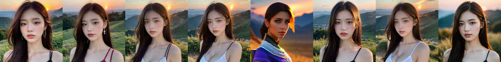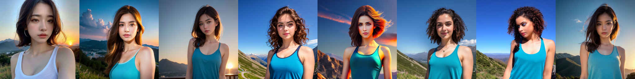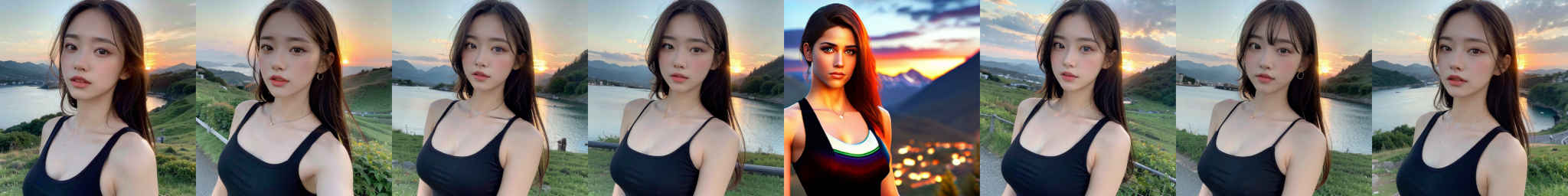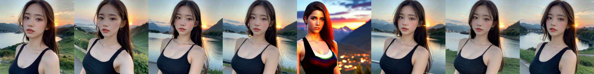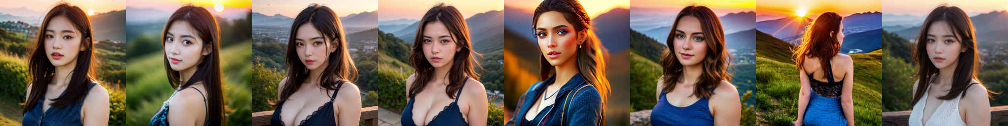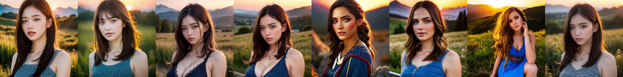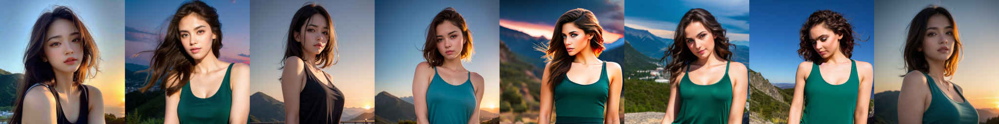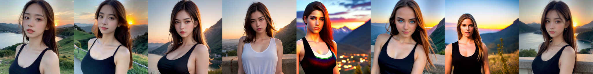 | P3 | masterpiece, best quality, ultra high res, extremely realistic,1girl, 1 beautiful woman, look at viewer, tank top, upper body,a mountain in background,beautiful sunset,beautiful eyes, detailed eyes, detailed hair,light on face, |