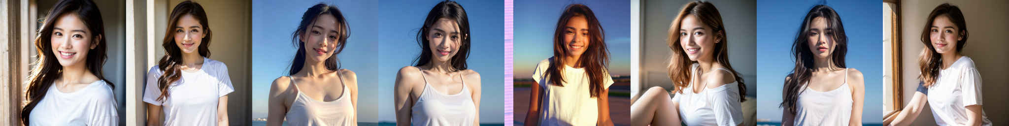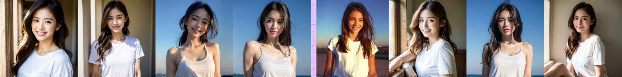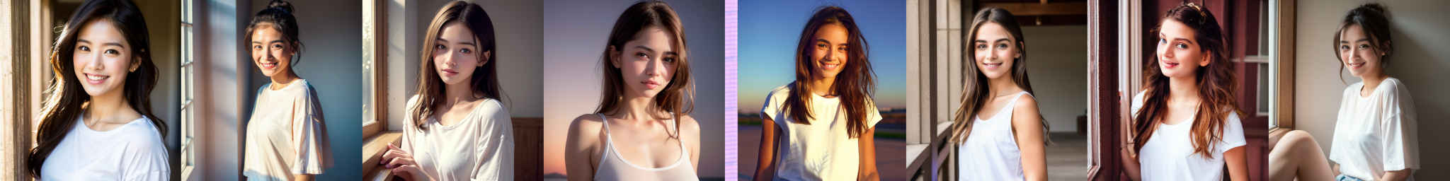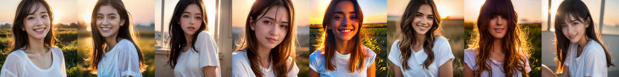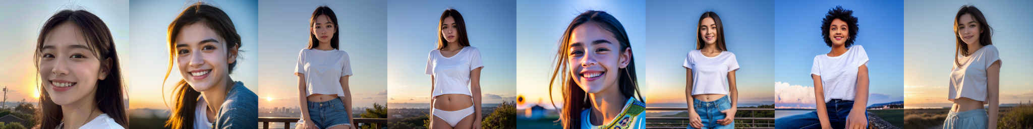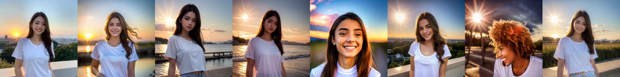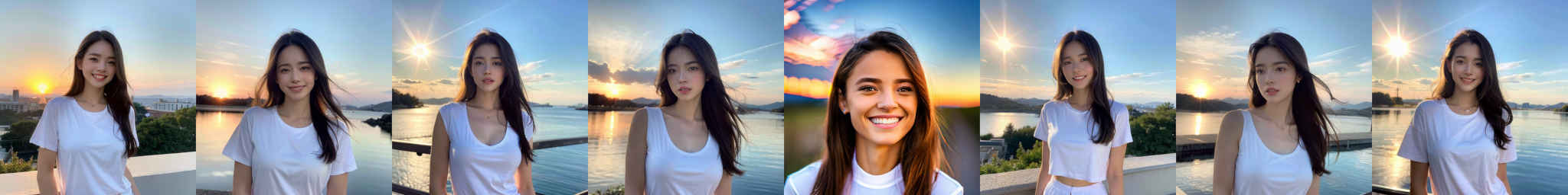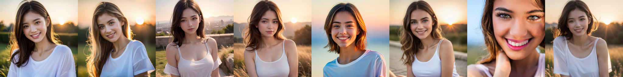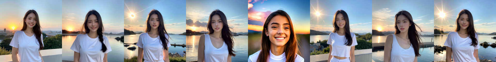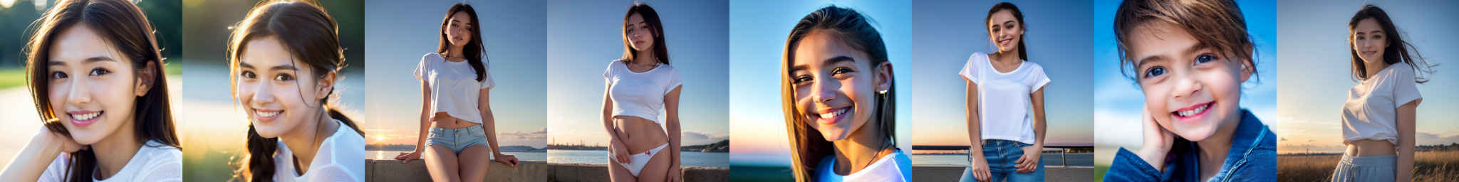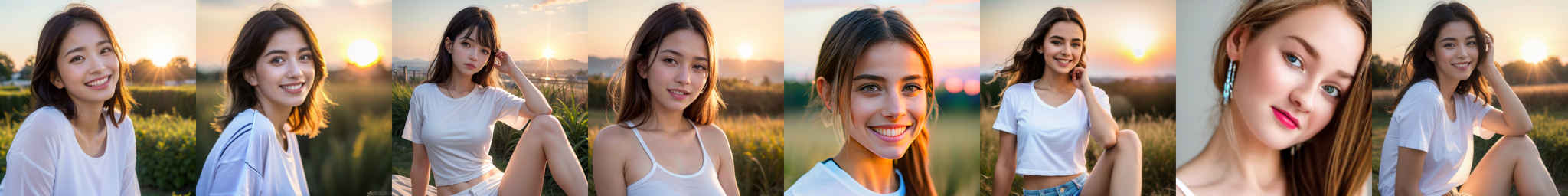 | P1 | best quality,masterpiece,ultra high res,(photo realistic:1.4),8K,RAW photo,real human skin,real human face,detailed face,detailed clothes,young beautiful girl, grin, morning glow, pastel sky, cool tones, sun rays, soft light, peaceful atmosphere, early morning serenity, white t shirt, short pants |