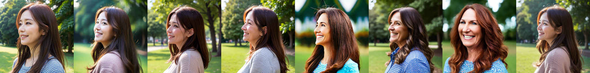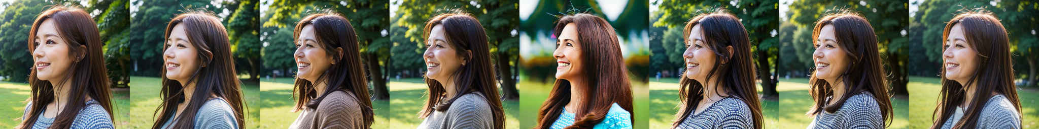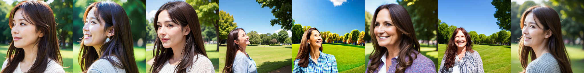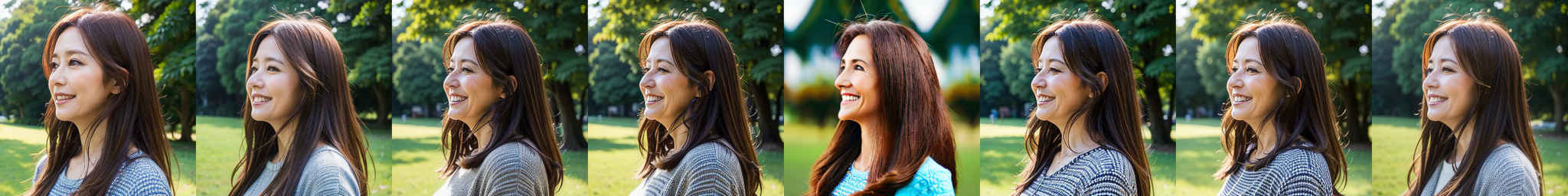 | 背景に木がある日当たりの良い公園の外に立つ、長い茶色の髪を持つ幸せな中年女性のプロフィール写真、デジタルアート | |