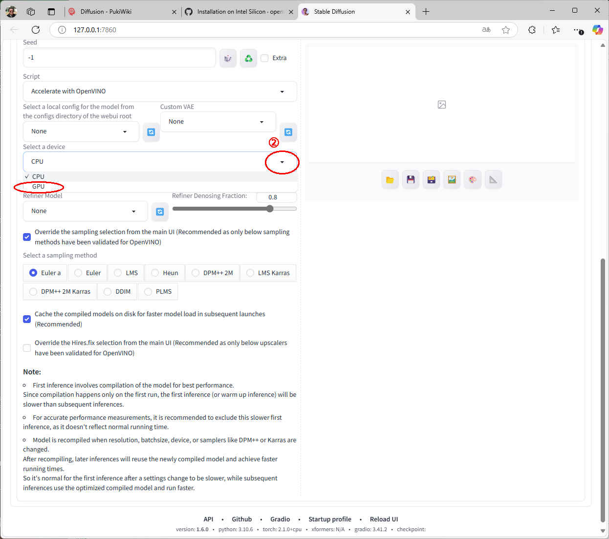 (StableDiffusion) PS C:\anaconda_win\workspace_3\stable-diffusion-webui> ./webui-user.bat Creating venv in directory C:\anaconda_win\workspace_3\stable-diffusion-webui\venv using python "C:\Users\izuts\anaconda3\envs\StableDiffusion\python.exe" venv "C:\anaconda_win\workspace_3\stable-diffusion-webui\venv\Scripts\Python.exe" fatal: No names found, cannot describe anything. : Warning: caught exception 'Torch not compiled with CUDA enabled', memory monitor disabled Downloading: "https://huggingface.co/runwayml/stable-diffusion-v1-5/resolve/main/v1-5-pruned-emaonly.safetensors" to C:\anaconda_win\workspace_3\stable-diffusion-webui\models\Stable-diffusion\v1-5-pruned-emaonly.safetensors *** Error loading script: openvino_accelerate.py Traceback (most recent call last): File "C:\anaconda_win\workspace_3\stable-diffusion-webui\modules\scripts.py", line 382, in load_scripts script_module = script_loading.load_module(scriptfile.path) File "C:\anaconda_win\workspace_3\stable-diffusion-webui\modules\script_loading.py", line 10, in load_module module_spec.loader.exec_module(module) File "<frozen importlib._bootstrap_external>", line 883, in exec_module File "<frozen importlib._bootstrap>", line 241, in _call_with_frames_removed File "C:\anaconda_win\workspace_3\stable-diffusion-webui\scripts\openvino_accelerate.py", line 47, in <module> from diffusers import ( File "C:\anaconda_win\workspace_3\stable-diffusion-webui\venv\lib\site-packages\diffusers\__init__.py", line 5, in <module> from .utils import ( File "C:\anaconda_win\workspace_3\stable-diffusion-webui\venv\lib\site-packages\diffusers\utils\__init__.py", line 38, in <module> from .dynamic_modules_utils import get_class_from_dynamic_module File "C:\anaconda_win\workspace_3\stable-diffusion-webui\venv\lib\site-packages\diffusers\utils\dynamic_modules_utils.py", line 28, in <module> from huggingface_hub import HfFolder, cached_download, hf_hub_download, model_info ImportError: cannot import name 'cached_download' from 'huggingface_hub' (C:\anaconda_win\workspace_3\stable-diffusion-webui\venv\lib\site-packages\huggingface_hub\__init__.py) :・「v1-5-pruned-emaonly.safetensors」ダウンロード途中で停止して動かない場合は 'Ctrl' + 'c' で強制終了(Webページが開くので閉じる)