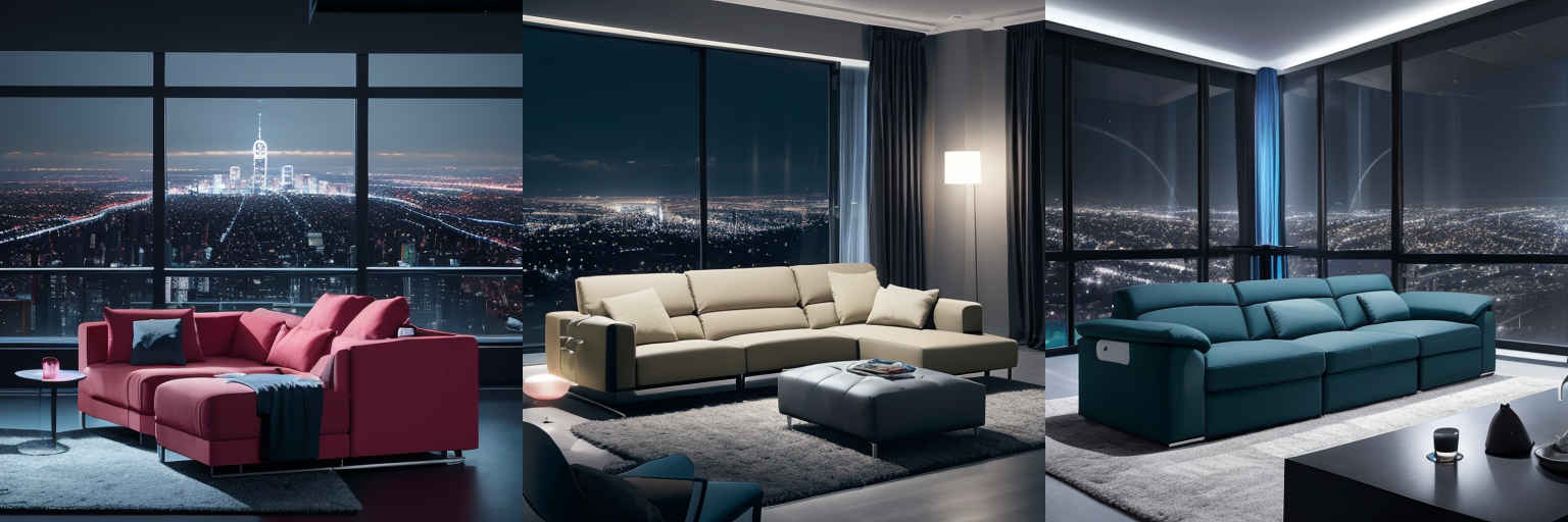 | A modular sofa with adaptive cushioning and embedded LED lighting, set in a modern living room with a panoramic city view | A futuristic smartwatch with a curved OLED display |