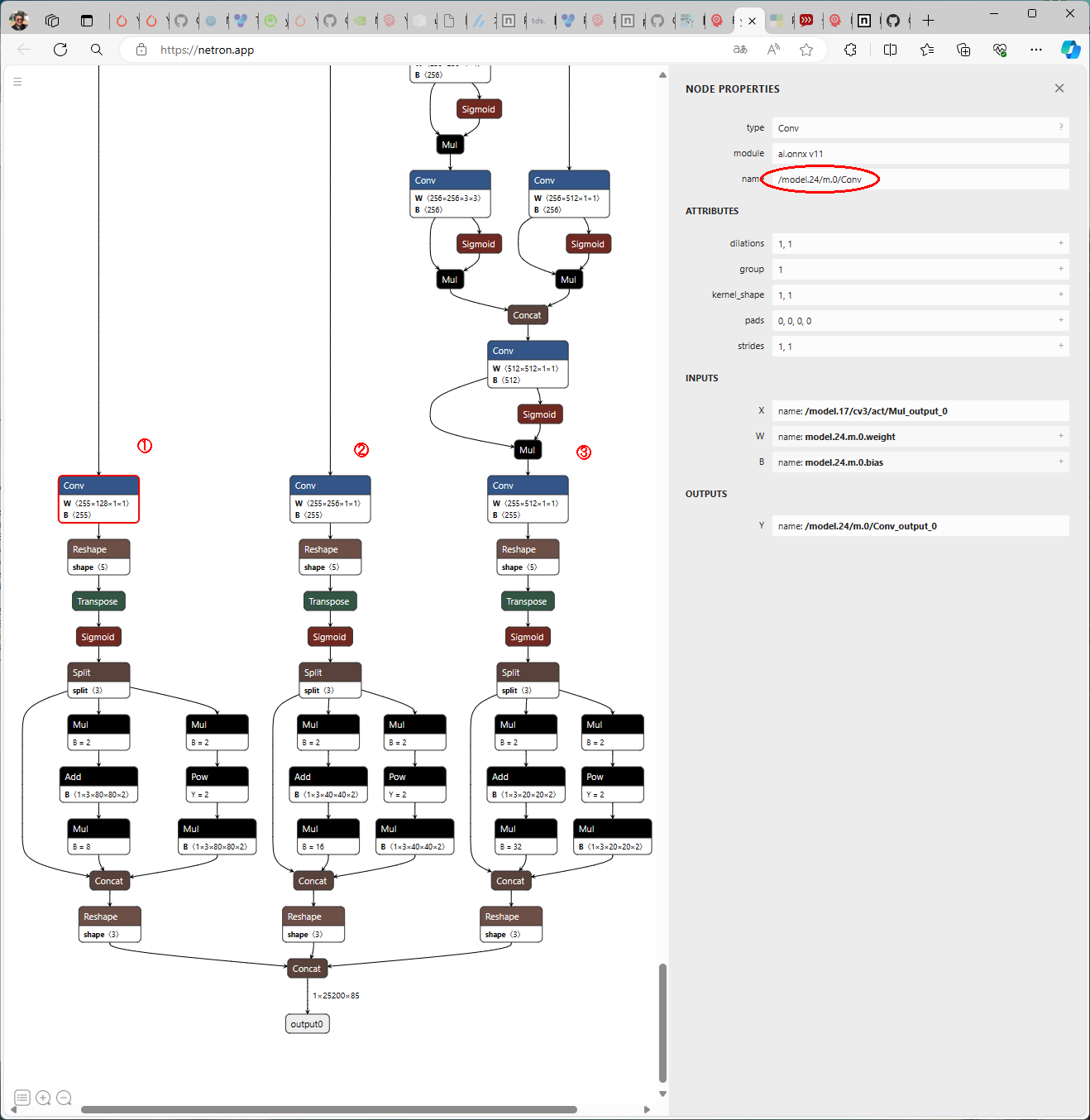 ・同様に ②「/model.24/m.1/Conv」, ③「/model.24/m.2/Conv」を得る