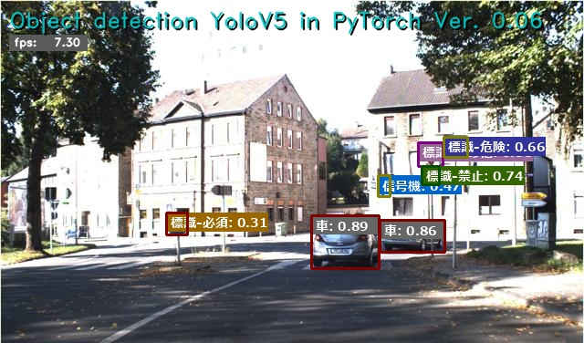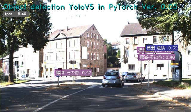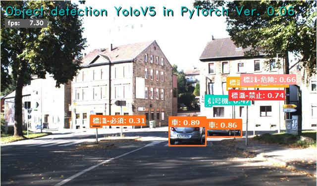 (py_learn) python detect2_yolov5.py -m ./runs/train/ts_yolov5s_ep30/weights/best.pt -i data/ts_dataset/images/val/00001.jpg -l ts_names_jp Object detection YoloV5 in PyTorch Ver. 0.05: Starting application... OpenCV virsion : 4.9.0 - Image File : data/ts_dataset/images/val/00001.jpg - YOLO v5 : ultralytics/yolov5 - Pretrained : ./runs/train/ts_yolov5s_ep30/weights/best.pt - Confidence lv: 0.25 - Label file : ts_names_jp - Program Title: y - Speed flag : y - Processed out: non - Use device : cuda:0 Using cache found in C:\Users\izuts/.cache\torch\hub\ultralytics_yolov5_master YOLOv5 2024-4-9 Python-3.11.8 torch-2.2.1+cu121 CUDA:0 (NVIDIA GeForce RTX 4070 Ti, 12282MiB) Fusing layers... Model summary: 157 layers, 7236673 parameters, 0 gradients, 16.5 GFLOPs Adding AutoShape... FPS average: 7.90 Finished.