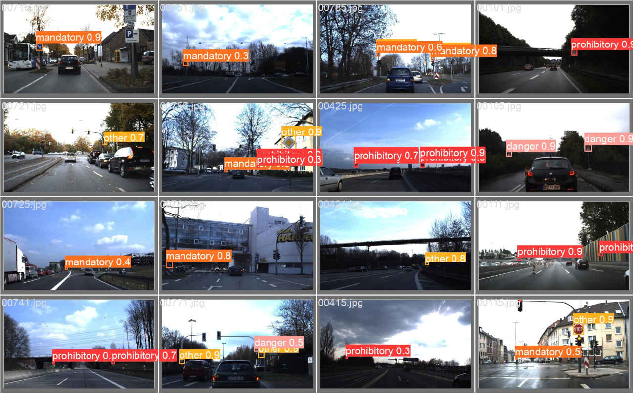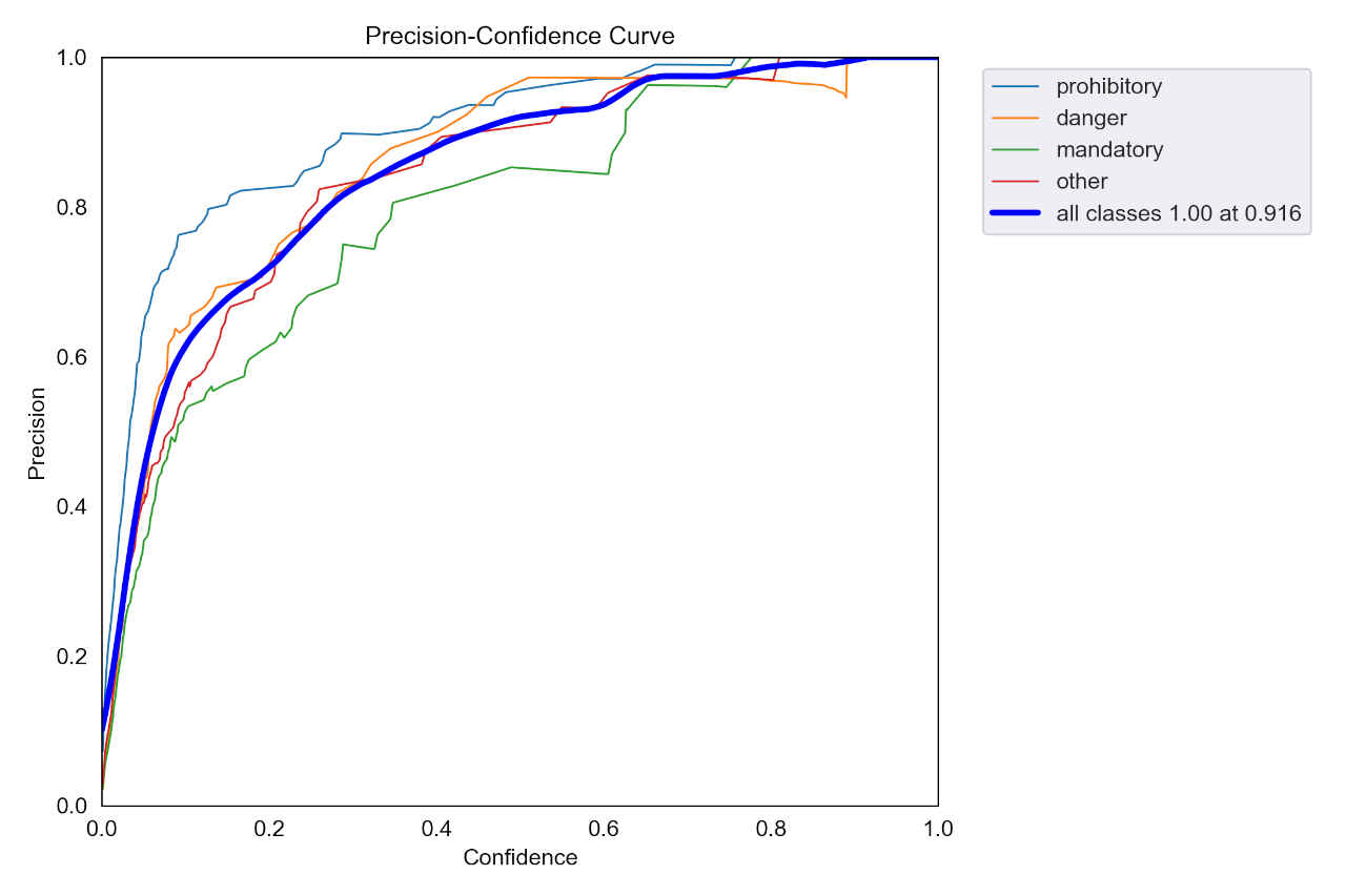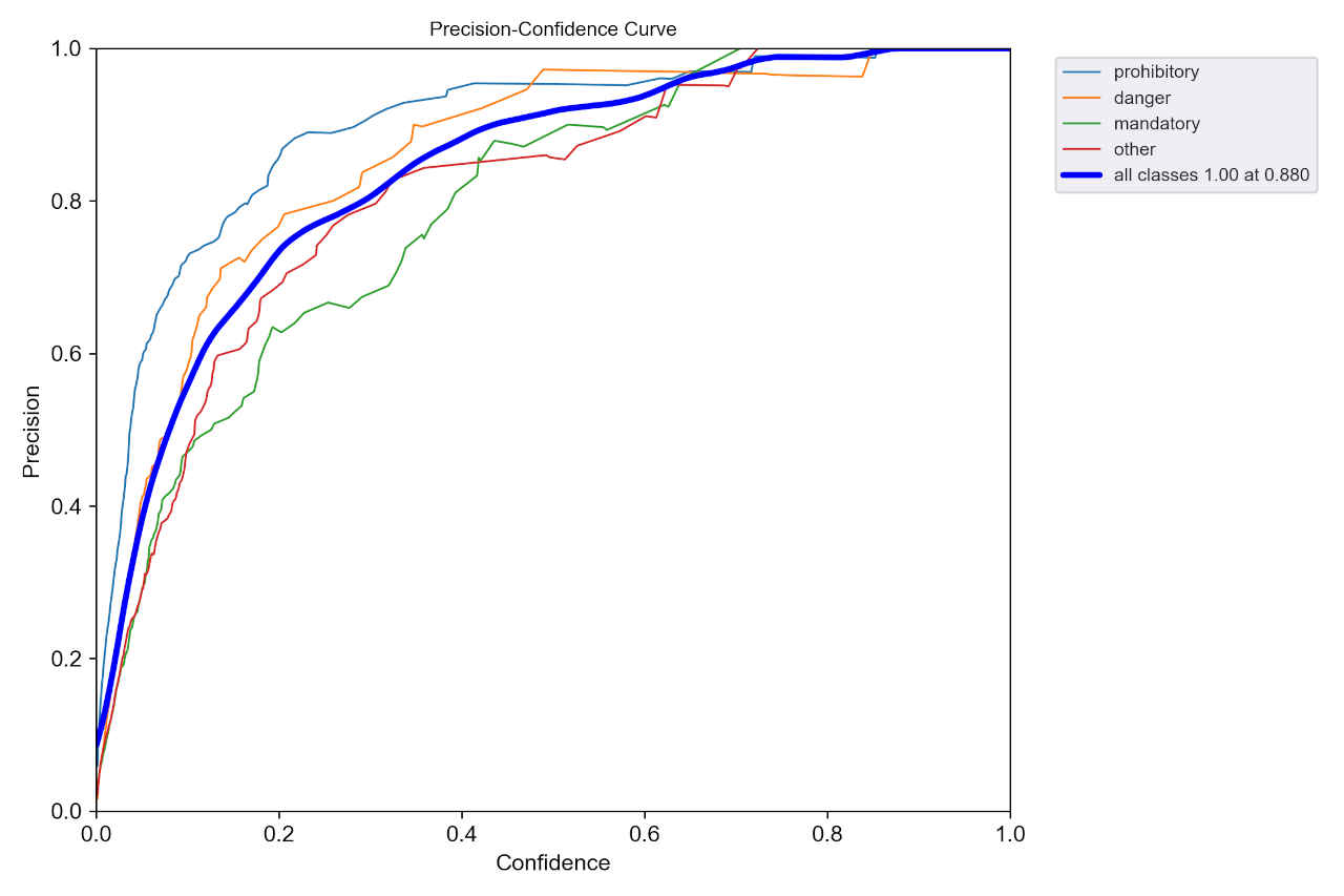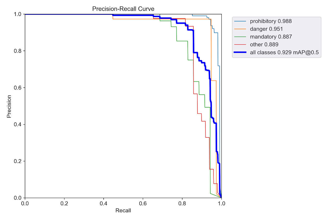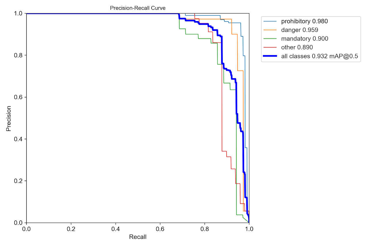 : Validating runs\train\ts0_yolov5s_ep30\weights\best.pt... Fusing layers... Model summary: 157 layers, 7020913 parameters, 0 gradients, 15.8 GFLOPs Class Images Instances P R mAP50 mAP50-95: 100%|██████████| 5/5 [00:01<0 all 150 230 0.924 0.89 0.929 0.683 prohibitory 150 108 0.96 0.944 0.988 0.793 danger 150 38 0.973 0.945 0.951 0.691 mandatory 150 35 0.85 0.812 0.887 0.621 other 150 49 0.911 0.857 0.889 0.627 Results saved to runs\train\ts0_yolov5s_ep30・学習結果モデルは「runs/train/ts0_dataset_ep30/weights」評価指標は「runs/train/ts0_dataset_ep30/」