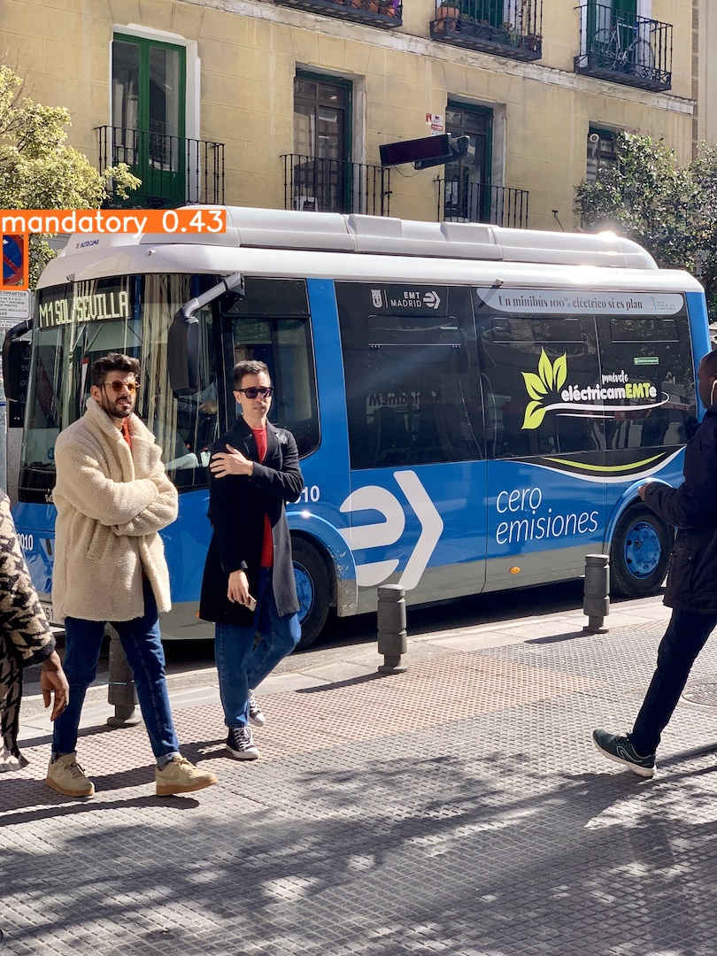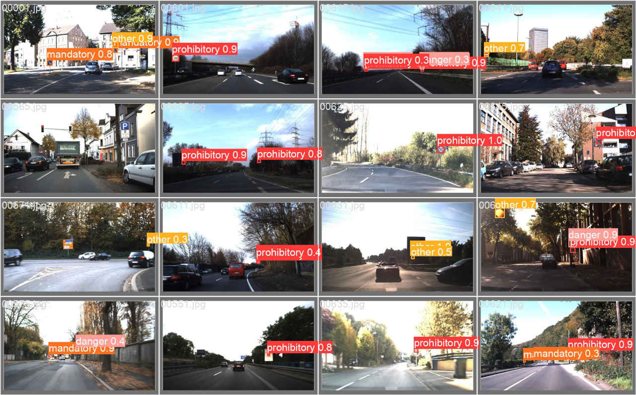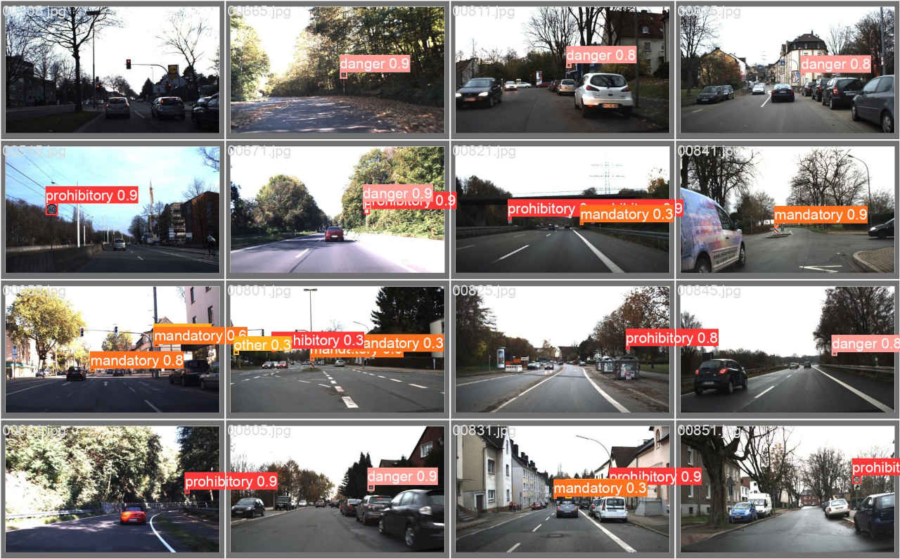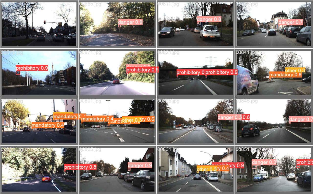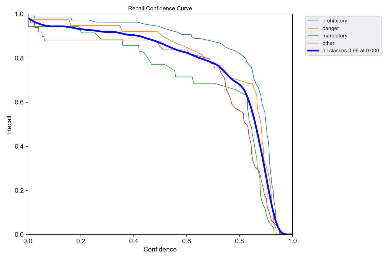 : Validating runs\train\ts0_yolov5s_ep30\weights\best.pt... Fusing layers... Model summary: 157 layers, 7020913 parameters, 0 gradients, 15.8 GFLOPs Class Images Instances P R mAP50 mAP50-95: 100%|██████████| 5/5 [00:01<0 all 150 230 0.924 0.89 0.929 0.683 prohibitory 150 108 0.96 0.944 0.988 0.793 danger 150 38 0.973 0.945 0.951 0.691 mandatory 150 35 0.85 0.812 0.887 0.621 other 150 49 0.911 0.857 0.889 0.627 Results saved to runs\train\ts0_yolov5s_ep30・学習結果モデルは「runs/train/ts0_dataset_ep30/weights」評価指標は「runs/train/ts0_dataset_ep30/」