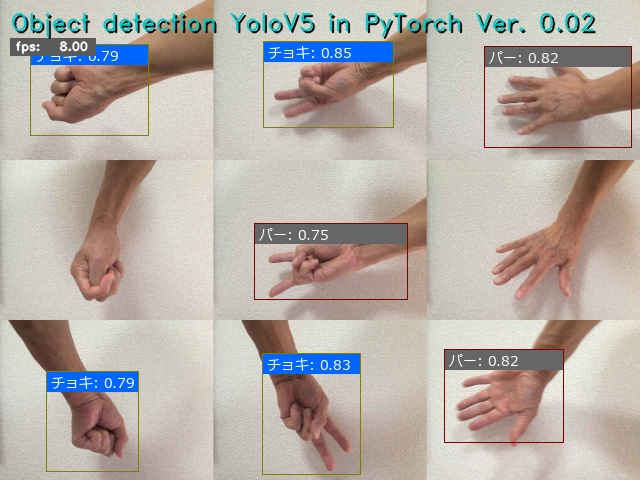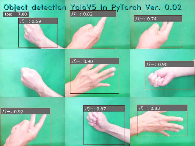 (py_learn) python detect2_yolov5.py -m ./runs/train/janken4_yolov5s/weights/best.pt -i ../../Images/janken3.jpg -l janken.names_jp Object detection YoloV5 in PyTorch Ver. 0.02: Starting application... OpenCV virsion : 4.9.0 - Image File : ../../Images/janken3.jpg - YOLO v5 : ultralytics/yolov5 - Pretrained : ./runs/train/janken4_yolov5s/weights/best.pt - Label file : janken.names_jp - Program Title: y - Speed flag : y - Processed out: non - Use device : cuda:0 Using cache found in C:\Users\izuts/.cache\torch\hub\ultralytics_yolov5_master YOLOv5 2024-4-9 Python-3.11.8 torch-2.2.1+cu121 CUDA:0 (NVIDIA GeForce RTX 4070 Ti, 12282MiB) Fusing layers... Model summary: 157 layers, 7018216 parameters, 0 gradients, 15.8 GFLOPs Adding AutoShape... FPS average: 7.90 Finished.