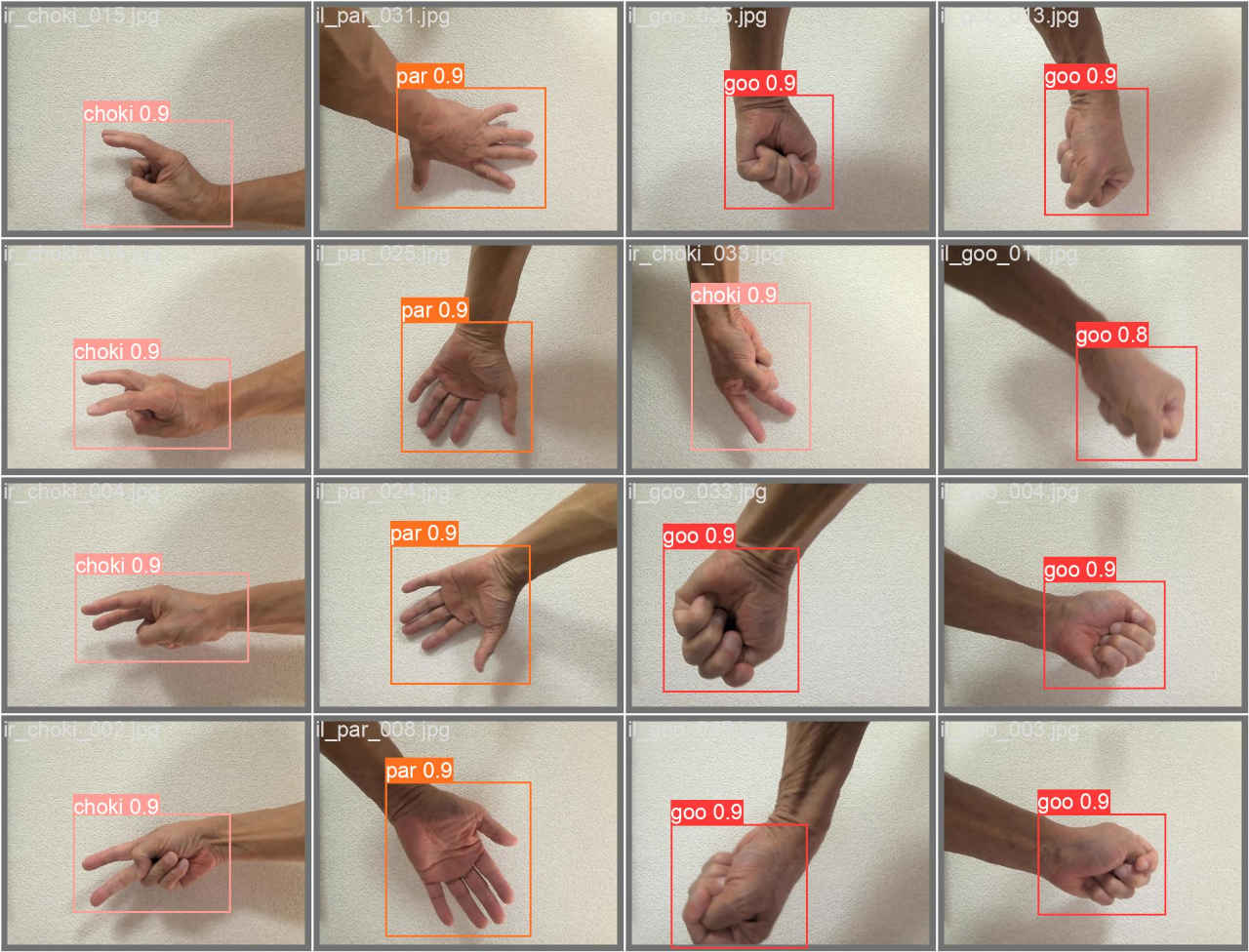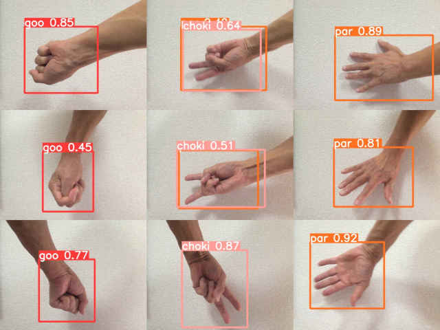 (py_learn) python detect2_yolov5.py -m ./runs/train/janken4_yolov5s/weights/best.pt -i ../../Images/janken.jpg -l janken.names_jp (py_learn) python detect2_yolov5.py -m ./runs/train/janken4_yolov5s/weights/best.pt -i ../../Images/janken2.jpg -l janken.names_jp