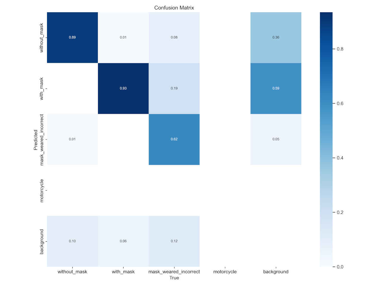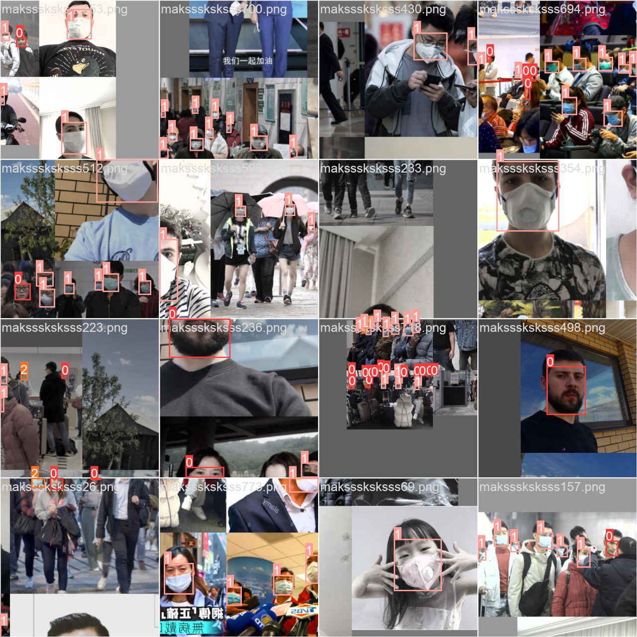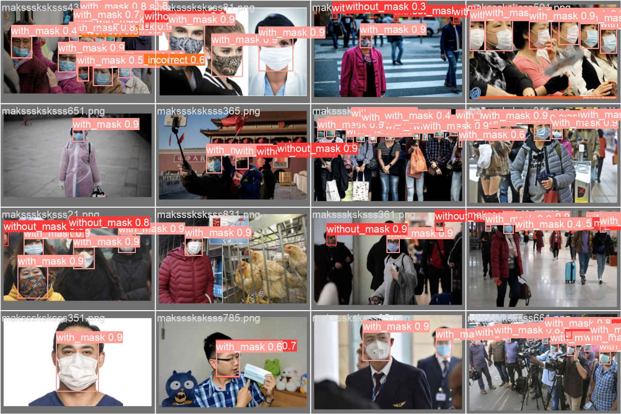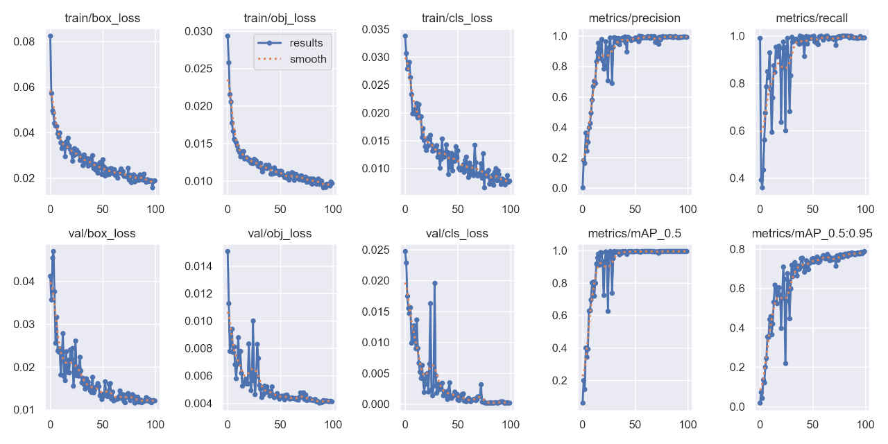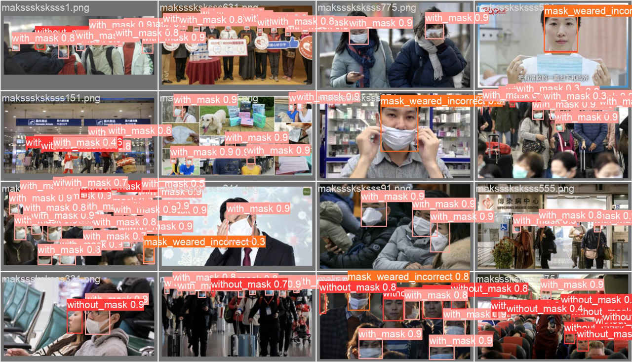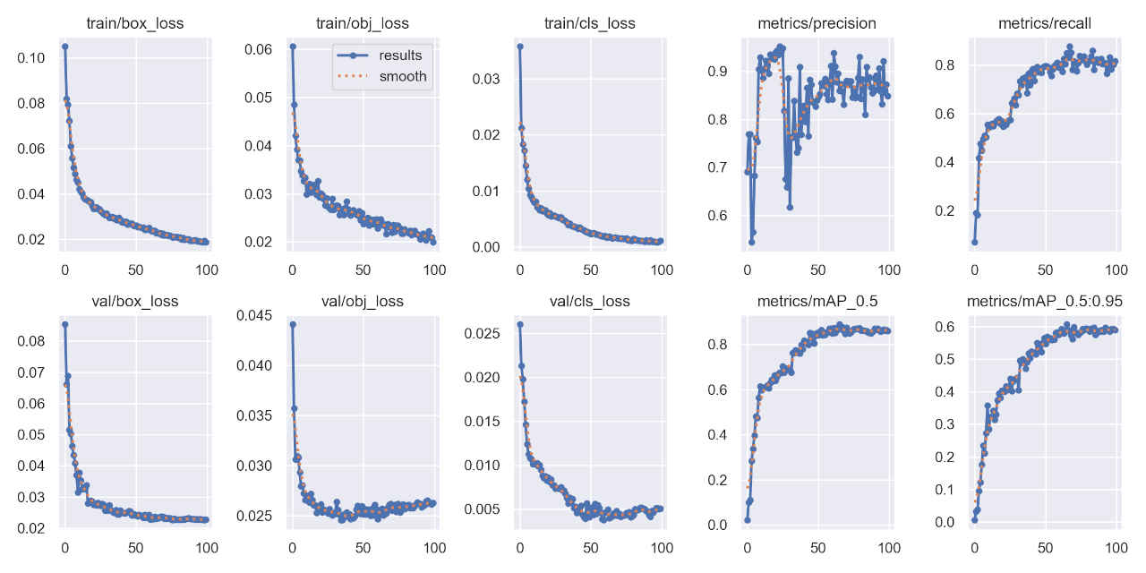 (py_learn) python train.py --epochs 100 --data data/mask_dataset/mask.yaml --weights yolov5s.pt --name mask_yolov5s train: weights=yolov5s.pt, cfg=, data=data/mask_dataset/mask.yaml, hyp=data\hyps\hyp.scratch-low.yaml, epochs=100, batch_size=16, imgsz=640, rect=False, resume=False, nosave=False, noval=False, noautoanchor=False, noplots=False, evolve=None, evolve_population=data\hyps, resume_evolve=None, bucket=, cache=None, image_weights=False, device=, multi_scale=False, single_cls=False, optimizer=SGD, sync_bn=False, workers=8, project=runs\train, name=mask_yolov5s, exist_ok=False, quad=False, cos_lr=False, label_smoothing=0.0, patience=100, freeze=[0], save_period=-1, seed=0, local_rank=-1, entity=None, upload_dataset=False, bbox_interval=-1, artifact_alias=latest, ndjson_console=False, ndjson_file=False github: YOLOv5 is out of date by 3 commits. Use 'git pull' or 'git clone https://github.com/ultralytics/yolov5' to update. YOLOv5 v7.0-294-gdb125a20 Python-3.11.8 torch-2.2.1+cu121 CUDA:0 (NVIDIA GeForce RTX 4070 Ti, 12282MiB) hyperparameters: lr0=0.01, lrf=0.01, momentum=0.937, weight_decay=0.0005, warmup_epochs=3.0, warmup_momentum=0.8, warmup_bias_lr=0.1, box=0.05, cls=0.5, cls_pw=1.0, obj=1.0, obj_pw=1.0, iou_t=0.2, anchor_t=4.0, fl_gamma=0.0, hsv_h=0.015, hsv_s=0.7, hsv_v=0.4, degrees=0.0, translate=0.1, scale=0.5, shear=0.0, perspective=0.0, flipud=0.0, fliplr=0.5, mosaic=1.0, mixup=0.0, copy_paste=0.0 Comet: run 'pip install comet_ml' to automatically track and visualize YOLOv5 runs in Comet TensorBoard: Start with 'tensorboard --logdir runs\train', view at http://localhost:6006/ Overriding model.yaml nc=80 with nc=4 from n params module arguments 0 -1 1 3520 models.common.Conv [3, 32, 6, 2, 2] 1 -1 1 18560 models.common.Conv [32, 64, 3, 2] 2 -1 1 18816 models.common.C3 [64, 64, 1] 3 -1 1 73984 models.common.Conv [64, 128, 3, 2] : Starting training for 100 epochs... Epoch GPU_mem box_loss obj_loss cls_loss Instances Size 0/99 3.35G 0.1051 0.06055 0.03577 79 640: 100%|██████████| 43/43 [00:04<00:00, 9. Class Images Instances P R mAP50 mAP50-95: 100%|██████████| 6/6 [00:01<0 all 171 778 0.69 0.0704 0.0216 0.00536 : Epoch GPU_mem box_loss obj_loss cls_loss Instances Size 99/99 4.41G 0.01885 0.01993 0.001163 75 640: 100%|██████████| 43/43 [00:03<00:00, 11. Class Images Instances P R mAP50 mAP50-95: 100%|██████████| 6/6 [00:01<0 all 171 778 0.848 0.814 0.86 0.59 100 epochs completed in 0.143 hours. Optimizer stripped from runs\train\mask_yolov5s\weights\last.pt, 14.4MB Optimizer stripped from runs\train\mask_yolov5s\weights\best.pt, 14.4MB Validating runs\train\mask_yolov5s\weights\best.pt... Fusing layers... Model summary: 157 layers, 7020913 parameters, 0 gradients, 15.8 GFLOPs Class Images Instances P R mAP50 mAP50-95: 100%|██████████| 6/6 [00:01<0 all 171 778 0.859 0.849 0.888 0.609 without_mask 171 122 0.773 0.885 0.899 0.59 with_mask 171 630 0.932 0.931 0.965 0.684 mask_weared_incorrect 171 26 0.872 0.731 0.801 0.554 Results saved to runs\train\mask_yolov5s